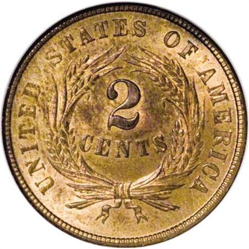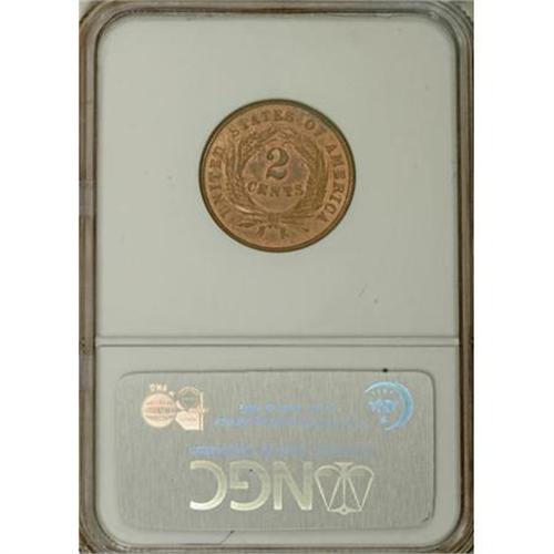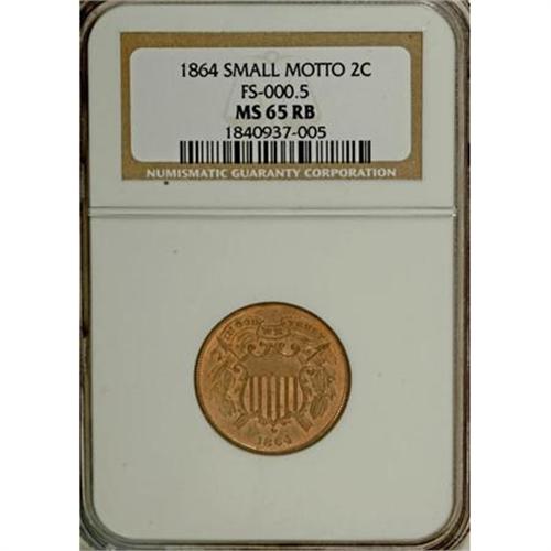 <B>1864 2C Small Motto MS65 Red and Brown NGC.</B></I> FS-000.5. The key date 1864 Small Motto two cent piece is attributed by the presence of the leaf stem, and the first T of TRUST being closer to the ribbon. Delectable orange-gold luster radiates from minimally marked surfaces that display some localized "browning." The strike is solid throughout. A few light freckles are noted on the obverse. Census: 51 in 65 Red and Brown, 14 finer (12/07).<BR><BR><B>Coin Engraver:</B> James B. Longacre<BR><BR><b>Shipping:</b> Coins & Currency (<a target="_blank" href="http://www.heritageauctions.com/common/shipping.php">view shipping information</a>)