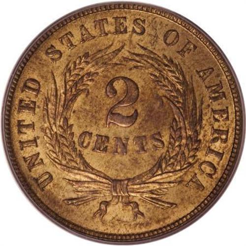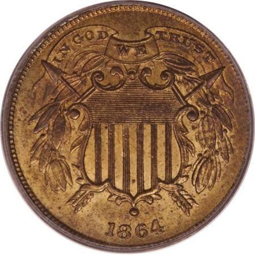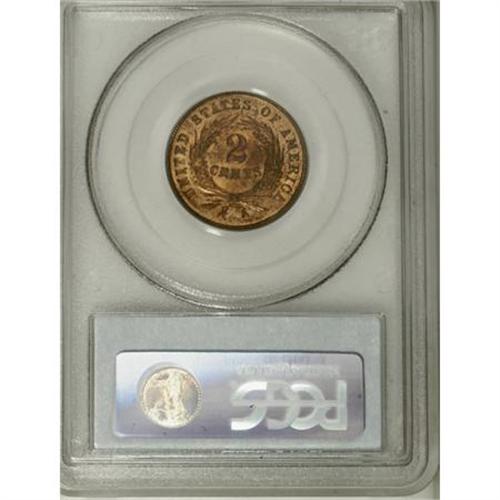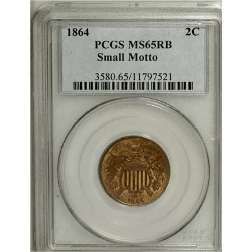 <B>1864 2C Small Motto MS65 Red and Brown PCGS.</B></I> A small number of Small Motto two cent pieces were struck in early 1864--probably no more than a couple of thousand coins. As such, these Small Motto two cent pieces were the first U.S. coins issued to bear the Congressionally mandated motto IN GOD WE TRUST. This is a particularly pleasing example. Well balanced overall, probably 80% of both obverse and reverse retain full red mint color. Almost a complete strike, the die crack on the upper reverse is light, indicating this piece was struck somewhere in the middle part of the production run for this issue.<BR><BR><B>Coin Engraver:</B> James B. Longacre<BR><BR><b>Shipping:</b> Coins & Currency (<a target="_blank" href="http://www.heritageauctions.com/common/shipping.php">view shipping information</a>)