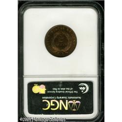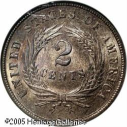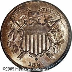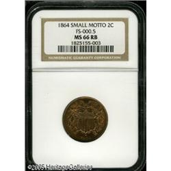 <B>1864 2C Small Motto MS66 Red and Brown NGC.</B></I> FS-000.5. An unknown, but obviously limited quantity of this desirable first year variety was produced from a single pair of dies. While several hundred Mint State pieces are known to be extant, rarely are they found in top grades. This glossy, silky-smooth representative is only modestly mellowed with dappled violet patina on the reverse. The coin's outstanding quality and originality are instantly recognizable. Population: 13 in 66, 0 finer (1/05). Lot:5627