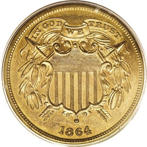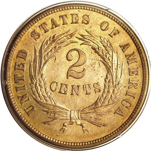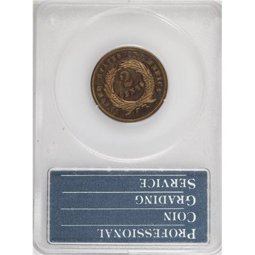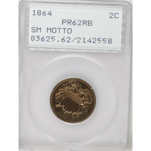 <B>1864<2C> Small Motto PR62 Red and Brown PCGS.</B></I> Offered here is a landmark coin with a rarity and desirability that cannot be overemphasized. Perhaps 1,000 or so proof two-cent pieces were struck in 1864 (some sources errantly report just 100 proofs), and nearly all were the Large Motto type. Few were the Small Motto type, and estimates place the number of survivors at less than 20 pieces. This issue is part of a trio of proof rarities from the decade that also includes the 1864-L Indian cent and the 1867 Rays Shield nickel.<BR> The two cent piece was hardly a new concept when it first appeared in 1864. Proposals for just such a denomination were made in Congress on two previous occasions, in 1806 and 1836. The second proposal included pattern issues that are highly collectible today. These first two proposals recommended coins of billon, a combination of copper and silver, but it was shown that such a combination was not practical, for it was easily imitated. The third proposal was initiated by the Mint, rather than by Congress. Mint Director James Pollock was successful with his bid, and the denomination was authorized by the Mint Act of April 22, 1864. This was the same legislation that authorized a change in the composition of the Indian cent, from copper-nickel to bronze.<BR> The initial two-cent coins of 1864 included proofs and business strikes from the Small Motto dies, called prototype dies by Breen. In his <I>Complete Encyclopedia,</B></I> Breen noted that proof examples have ER of AMERICA doubled, although such a characteristic is not visible on this example. Although certified at a lower numeric grade, this example is a splendid proof with excellent eye appeal. Both sides have light hairlines and minor spots, but do not have any individually distracting blemishes. The fields are nicely mirrored with lustrous devices that provide a hint of cameo contrast. Bo