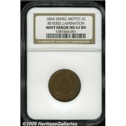 <B>1864 2C Small Motto Two Cent Piece MS62 Brown NGC.</B></I> FS-000.5. A lamination on the field between STATES and OF stands out because it is less toned than the remainder of this deep chocolate-brown piece. Retained laminations are present beneath TS in CENTS. A faint fingerprint is at 5 o'clock, and a whisper of verdigris is at 8 o'clock. A challenging subtype in Mint State.