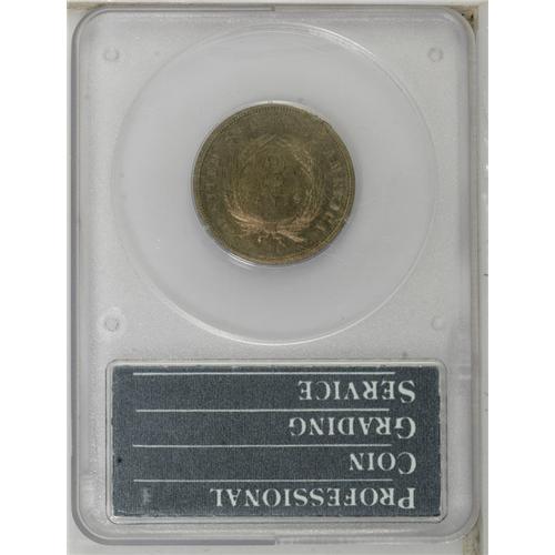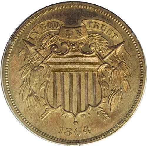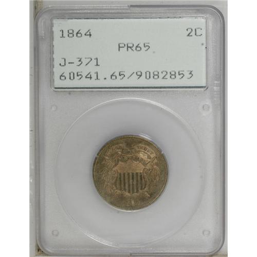 <B>1864 2C Two Cents, Judd-371, Pollock-440, Low R.6, PR65 PCGS.</B></I> From regular issue Large Motto dies and with the expected plain edge, but struck in copper-nickel instead of the usual bronze alloy. Gold, rose, and cobalt-blue colors alternate across this well struck and nicely mirrored Gem. An interesting mint-made lamination is on the reverse at 1 o'clock. Certified in a first generation PCGS holder.<BR><BR><b>Shipping:</b> Coins & Currency (<a target="_blank" href="http://www.heritageauctions.com/common/shipping.php">view shipping information</a>)