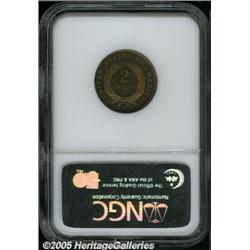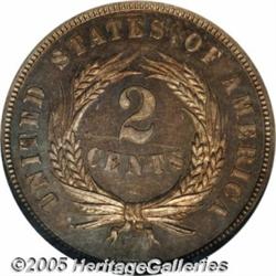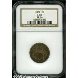 <B>1864 2C Two Cents, Judd-371, Pollock-440, Low R.6, PR64 NGC.</B></I> Struck from the regular coinage dies with Large Motto in copper-nickel composition with a plain edge. This interesting off-metal pattern shows scattered lilac patina interspersed with deeper, cherry-red over each side. A few scattered carbon spots account for the grade.
