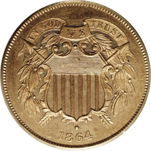<B>1864 2C Two Cents, Judd-371, Pollock-440, R.6, PR64 PCGS.</B></I> Struck with a plain edge on regular Large Motto two cent piece dies, but the composition is copper-nickel rather than copper. This razor-sharp near-Gem has attractive apricot-gold color. Well preserved despite a few miniscule carbon flecks on the obverse.