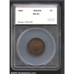 1864 2C Two Cents Large Motto MS65 Brown SEGS (MS63 Brown).  A razor sharp strike with iridescent surfaces and slight evidence of original mint red color.  Important notice: We expect to be auctioning lots at the rate of 200-250 per hour. Sometimes eBay Premier live bid software cannot keep up with that pace, so we strongly recommend that you place a realistic proxy bid now as insurance to avoid disappointment. Also please note that all Heritage/CAA lots purchased through eBay Premier carry a 20% Buyer's Premium.