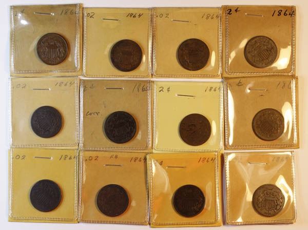 1864 Two-Cent, 12 pieces. AG to AU.