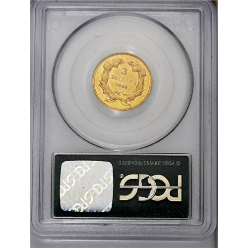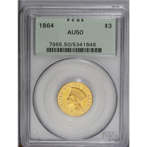 <B>1864<$3> AU50 PCGS.</B></I> This Civil War issue is scarce in AU and up. This lightly worn and somewhat lustrous butter-yellow coin is housed in a green label holder. Population: 16 in 50, 79 finer (7/06).<BR><I>From The Derrick Snider Collection.</B></I>