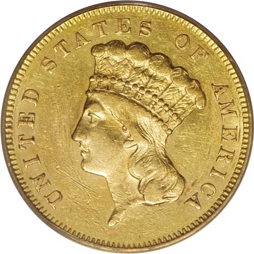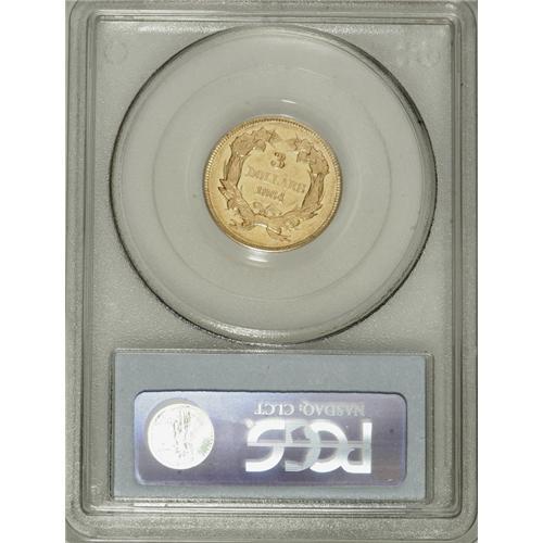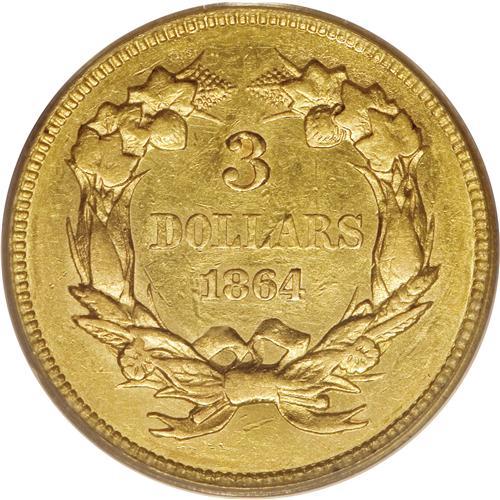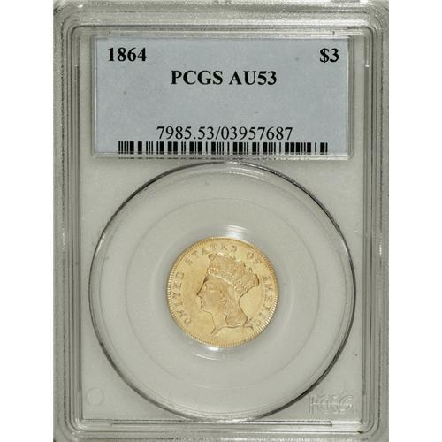 <B>1864 $3 AU53 PCGS.</B></I> The 1864 three dollar gold is popular as one of the five Civil War issues in the series. The mintage for the 1864--2,680 pieces--is second-lowest behind the 1865, of which only 1,140 coins were made, and both years see steady collector demand. Despite the low mintages, however, collectors of the time appear to have saved significant numbers of coins. Numerous scrapes are seen in the fields before the head of Liberty, as well as on the neck and cheek, along with the die striations at the periphery that are usually seen on this issue. The lustrous surfaces are lemon-gold, and the reverse die is rotated about 20 degrees clockwise. Population: 18 in 53, 58 finer (3/07).<BR><BR><b>Shipping:</b> Coins & Currency (<a target="_blank" href="http://www.heritageauctions.com/common/shipping.php">view shipping information</a>)