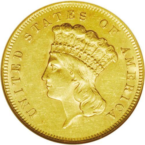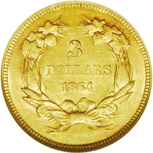 <B>1864<$3> AU58 NGC.</B></I> The 1864 three dollar piece had a mintage of 2,630 business strikes, and fewer than 200 coins are believed to exist, most in various circulated grades. Peach and apricot-gold surfaces exhibit traces of light green, and a small scattering of light contact marks. The design elements are generally well impressed, except for minor softness in portions of Liberty's hair.