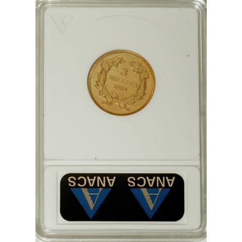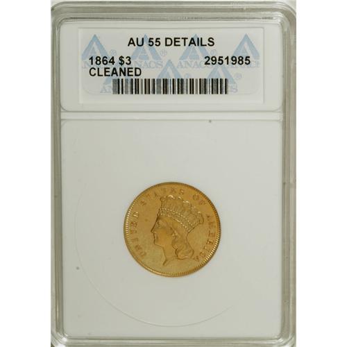 <B>1864 $3 --Cleaned--ANACS. AU55 Details.</B></I> The 18 in the date is repunched, probably diagnostic for this rare Civil War date, since a mere 2,630 pieces were struck. A moderately hairlined peach-gold and lime example. Purchased by Karl Stecher Sr. in December 1935 for $7.00 from E.K. Washburn.<BR><I>From The Stecher Collection, Part Two.</B></I><BR><BR><b>Shipping:</b> Coins & Currency (<a target="_blank" href="http://www.heritageauctions.com/common/shipping.php">view shipping information</a>)