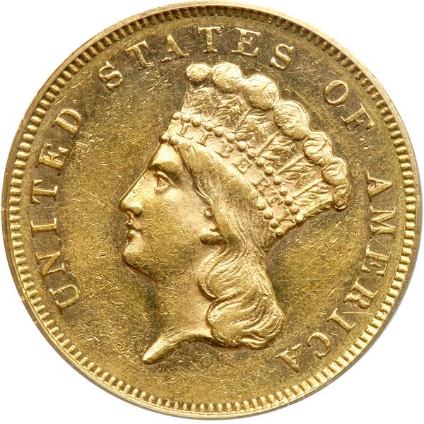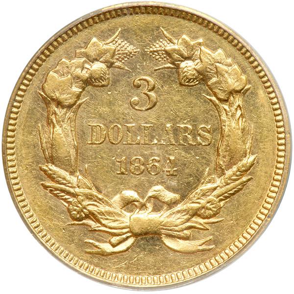 1864. PCGS graded AU-55 CAC Approved. A lustrous untoned example and quite choice for the grade. Rare low mintage date as only 2,630 were struck. Pop 25; 46 finer (PCGS # 7985) .
