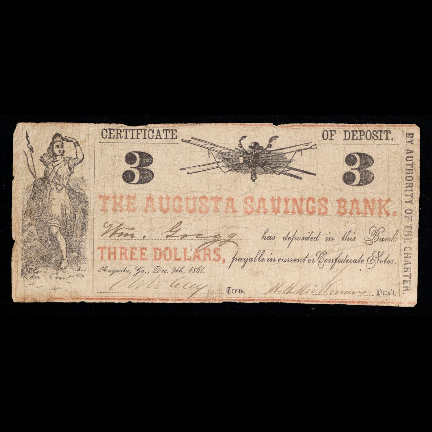 1864 $3 Note Bank Of Augusta, Georgia Grades f+.