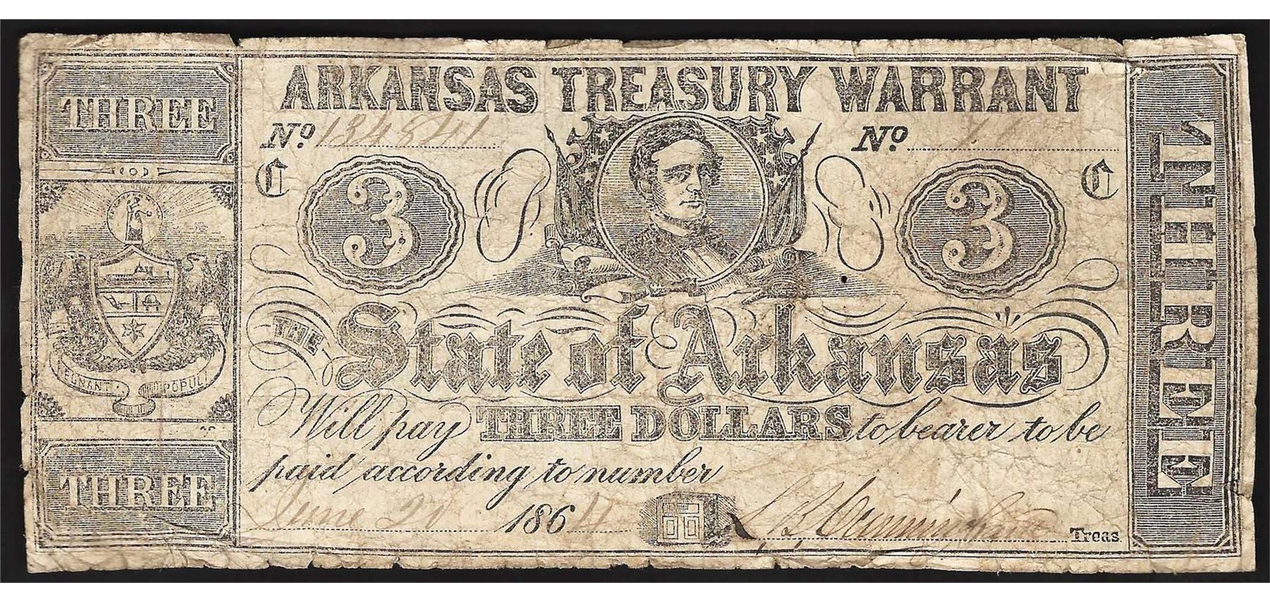 One 1864 $3 State of Arkansas Treasury Warrant Note.