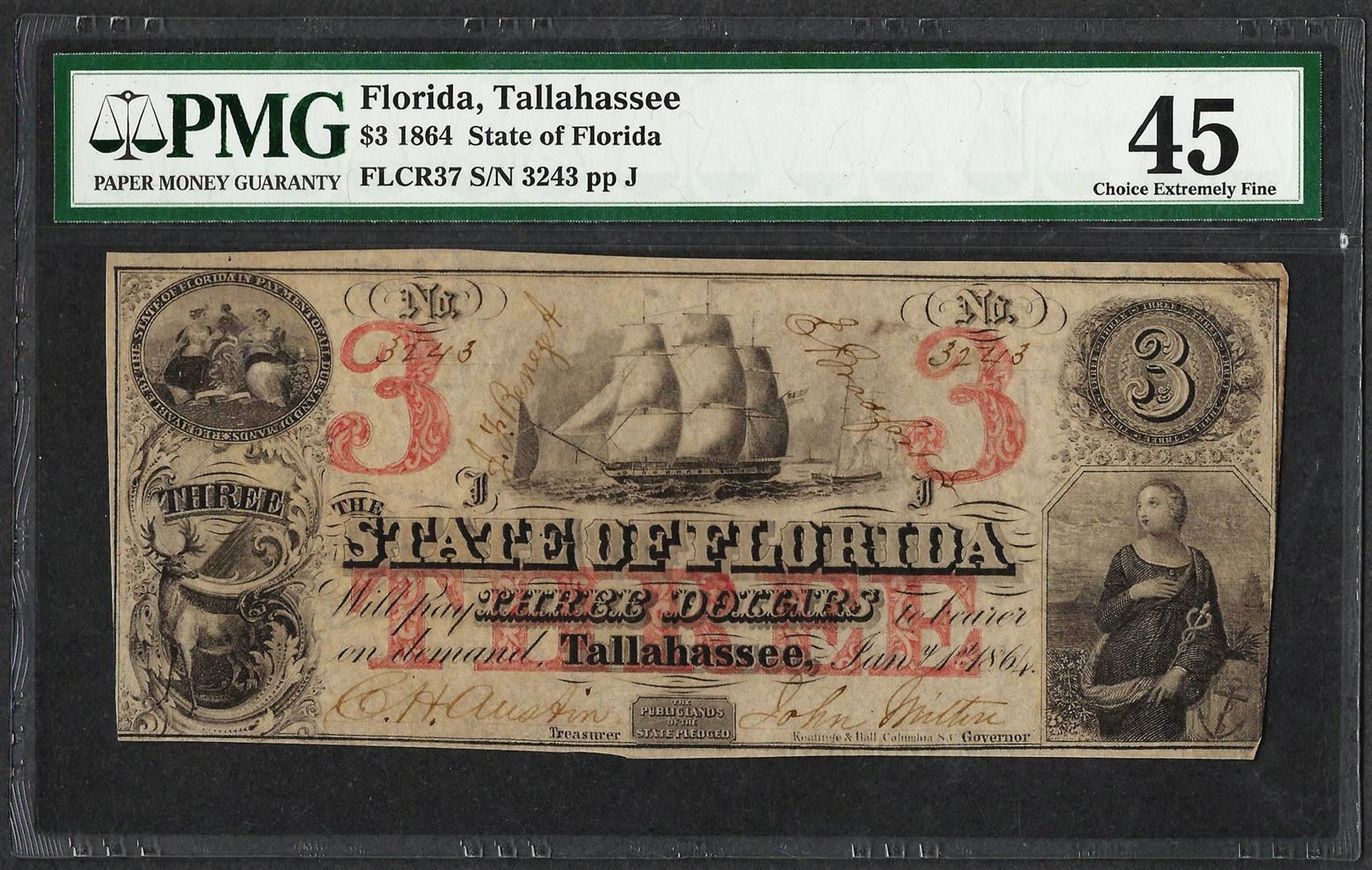 One 1864 $3 State of Florida Tallahassee Obsolete Note PMG Choice Extremely Fine 45. PMG Certified.