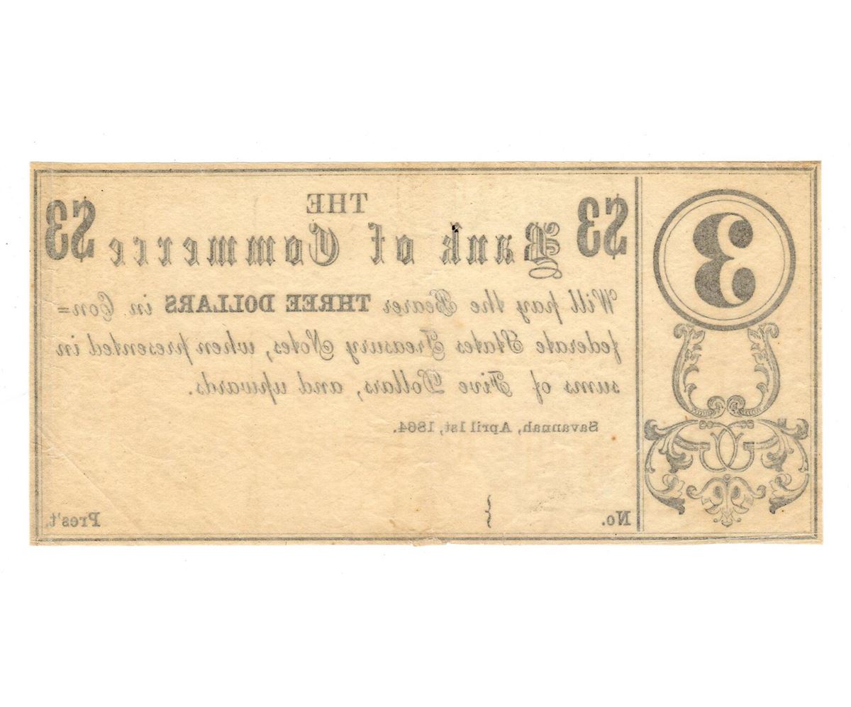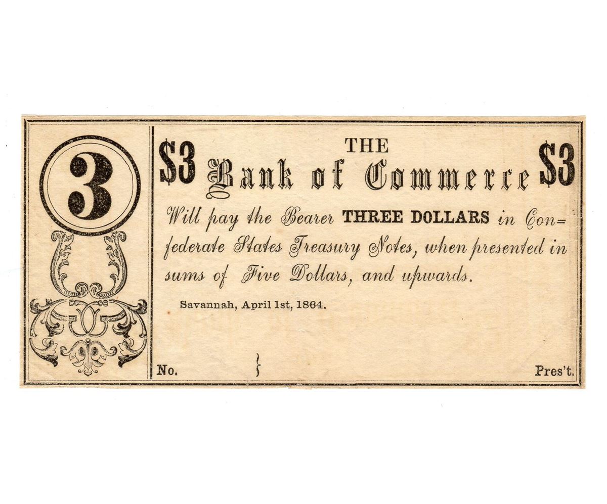 One 1864 $3 The Bank of Commerce Savannah, Georgia Note.