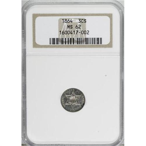 <B>1864 3CS MS62 NGC.</B></I> Crisply struck with glassy, prooflike fields and speckled russet and green patina on both sides. A few wispy pinscratches and carbon flecks restrict the grade. Only 12,000 pieces were struck of this reduced Civil War issue, at a time when silver and gold coins were widely hoarded. <BR><BR><b>Shipping:</b> Coins & Currency (<a target="_blank" href="http://www.heritageauctions.com/common/shipping.php">view shipping information</a>)