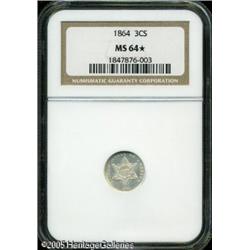 <B>1864 3CS MS64 <img border='0' src='http://www.heritagecoins.com/images/star.gif' width=10 height=10> NGC.</B></I> A very attractive, nearly white, exquisitely struck Civil War Three Cent Silver piece. Heavy clash marks are noted on the obverse. Lot:5663