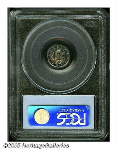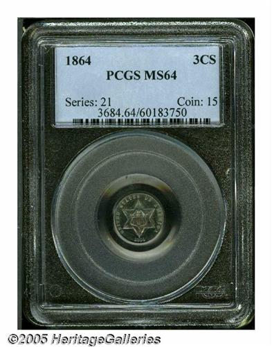 <B>1864<3CS> MS64 PCGS.</B></I> Lustrous surfaces are occupied by golden-brown and lavender patina in the centers, framed by deep cobalt-blue around the borders. This trime exhibits excellent strike definition, and is seemingly devoid of significant contact marks. Population: 20 in 64, 37 finer (6/05).