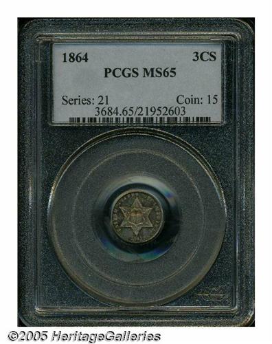 1864 3CS MS65 PCGS. Only 12,000 pieces were struc