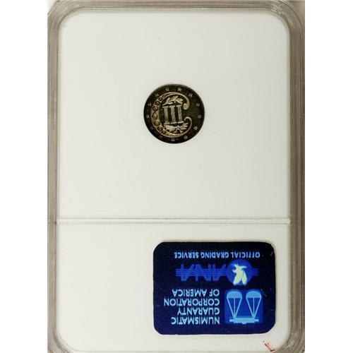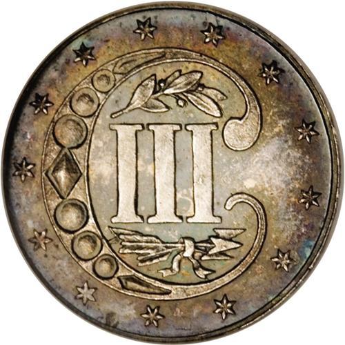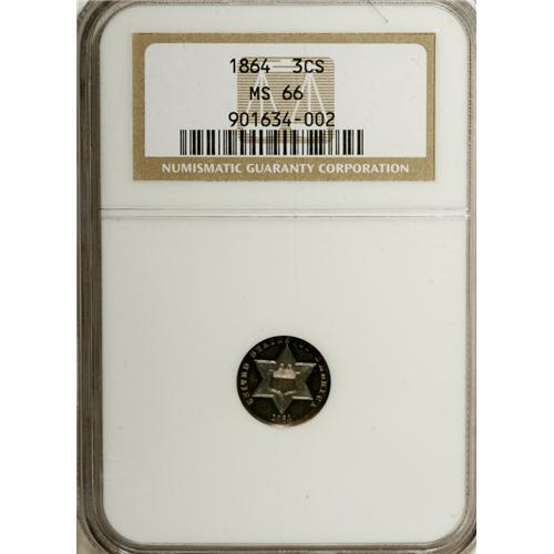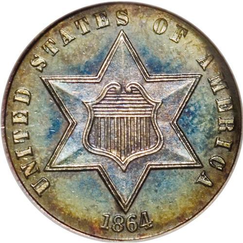 <B>1864 3CS MS66 NGC.</B></I> Delectably toned in shades of aqua-blue and lilac on the obverse, while the reverse shows a silver center and green-gold patina near the rims. Among the first of a long string of low-mintage issues before the series ceased entirely nine years later. Census: 12 in 66, 13 finer (12/06).<BR><I>From The Hill Country Collection.</B></I><BR><BR><b>Shipping:</b> Coin/Currency (<a target="_blank" href="http://www.heritageauctions.com/common/shipping.php">view shipping information</a>)