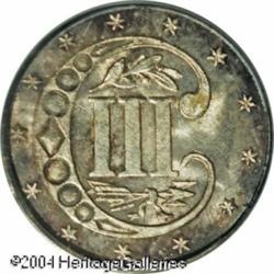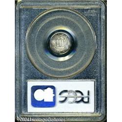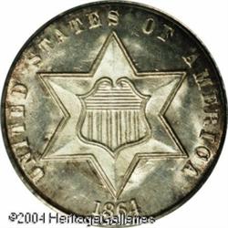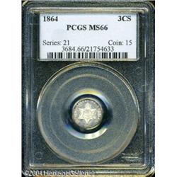 1864 3CS MS66 PCGS. Only 12,000 pieces were struck <B>1864 3CS MS66 PCGS.</B></I> Only 12,000 pieces were struck of this date, representing only a token mintage as most silver coins were melted or exported during the Civil War. This is a remarkably well preserved coin that has thick underlying mint luster that is overlaid with some peripheral russet toning. As with other business strikes we have encountered of this date, the fields show heavy die clashing. An unusual issue to locate as a high grade business strike. Population: 20 in 66, 9 finer (10/04). <BR><BR><B>Important notice:</B> Heritage usually auctions material at the rate of 200-250 lots per hour. On some occasions eBay Live bid software or the Internet may not be able to keep up with the pace of the auction. We recommend placing a realistic absentee bid now as insurance to avoid disappointment. Occasionally the auctioneer may eliminate or reject an eBay Live bid, and the auctioneer may also reopen a lot after the close of the eBay live bidding (usually because we missed an audience bid), and may reject your bid even if it shows you as the winning bidder. By bidding via eBay Live, you agree that Heritage may award the lot to another bidder at its sole discretion under the circumstances described above or any other reasonable circumstances. Since eBay bids are not shown to us until we open the lot on the floor, we treat those bids just like floor bids. In most cases the floor responds before the eBay bid is presented to us, due to Internet lag time, so for consistency we have made it a policy that floor bids are always considered first over tie eBay live bids. Also please note that all Heritage lots purchased through eBay Live carry a 20% Buyer's Premium. Please make sure you read the Terms and Conditions before you bid. This lot is being auctioned in conjunction with a live floor auction by Heritage Galleries & Auctioneers. All final auction and invoice information will be supplied by Heritage Galleries & Auctioneers, and all other information should be considered preliminary. Lot:5480