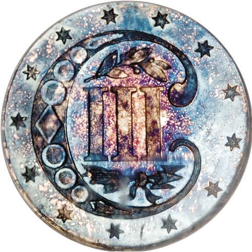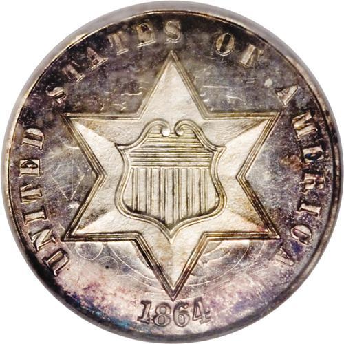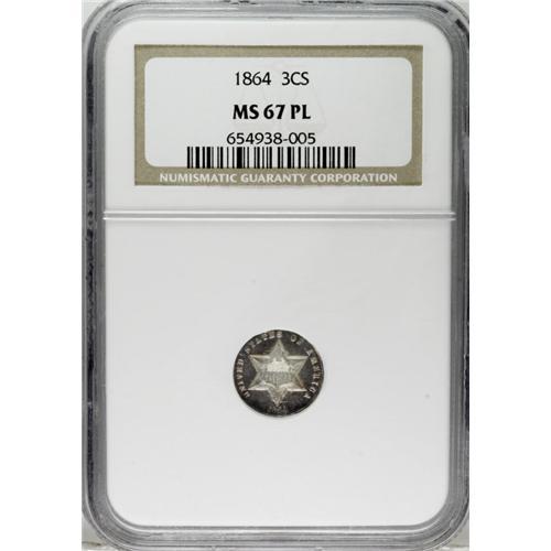<B>1864 3CS MS67 Prooflike NGC.</B></I> This piece is totally reflective and at first glance appears to be a proof, but the obverse die shows strong clash marks, which should not be the case if this were actually a proof. Of course, this is a rare date with a total mintage of 12,000 pieces, and it is likely that the dies had scarcely lost their polish when the business strikes were coined. Toned with deep peripheral gold on the obverse. The reverse is dark blue with a vibrant orange-gold center. A sparkling jewel with pristine surfaces. Census: 8 in 67 Prooflike, 5 finer (12/06).<BR><BR><b>Shipping:</b> Coin/Currency (<a target="_blank" href="http://www.heritageauctions.com/common/shipping.php">view shipping information</a>)