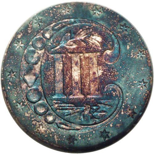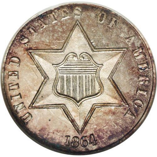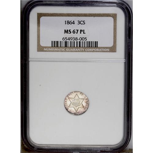 <B>1864<3CS> MS67 Prooflike NGC.</B></I> Totally reflective and at first glance appears to be a proof, but the obverse die shows very strong clash marks, which should not be the case if this were actually a proof. Of course, this is also a very rare date with a total mintage of 12,000 pieces, and it is likely that the dies had scarcely lost their polish when the business strikes were coined. Toned with deep peripheral gold on the obverse, the reverse is dark blue with a vibrant orange-gold center. Pristine surfaces and a sparkling jewel. Census: 8 in 67, 4 finer (3/06). <BR><BR><B>Important notice:</B> Heritage usually auctions material at the rate of 200-250 lots per hour. On some occasions eBay Live bid software or the Internet may not be able to keep up with the pace of the auction. We recommend placing a realistic absentee bid now as insurance to avoid disappointment. Occasionally the auctioneer may eliminate or reject an eBay Live bid, and the auctioneer may also reopen a lot after the close of the eBay live bidding (usually because we missed an audience bid), and may reject your bid even if it shows you as the winning bidder. By bidding via eBay Live, you agree that Heritage may award the lot to another bidder at its sole discretion under the circumstances described above or any other reasonable circumstances. Since eBay bids are not shown to us until we open the lot on the floor, we treat those bids just like floor bids. In most cases the floor responds before the eBay bid is presented to us, due to Internet lag time, so for consistency we have made it a policy that floor bids are always considered first over tie eBay live bids. Also please note that all Heritage lots purchased through eBay Live carry a 20% Buyer's Premium. Please make sure you read the Terms and Conditions before you bid. This lot is being auctioned in conjunction with a live floor auction by Heritage Galleries & Auctioneers. All final auction and invoice information will be supplied by Heritage Galleries & Auctioneers, and all other information should be considered preliminary. Lot:764 <BR><BR><B>Winning Notification and Billing:</B> After the FINAL session in this auction is complete, Heritage will send e-mail and snail mail invoices. This process normally takes several days. All final auction and invoice information will be supplied by Heritage Galleries & Auctioneers, and all other information should be considered preliminary. <BR><BR>This auction will be conducted on a live auction floor and over the Internet through eBay Live. If you choose to place an absentee bid, please take a moment to <font color='#0000ff'><u><a href='http://pages.ebay.com/liveauctions/help/before/laabsentee.html'>learn how eBay Live absentee bidding works</a></u></font><font color='#000000'>