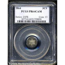 <B>1864<3CS> PR64 Cameo PCGS.</B></I> Exquisite powder-blue, gold, rose, and lilac colors grace this needle-sharp near-Gem. Only a faint handling mark near the first A in AMERICA stands in the way of a decidedly finer grade. One of only 470 proofs struck. Population: 1 in 64 Cameo, 7 finer (3/04). <BR><BR><B>Important notice:</B> Heritage usually auctions material at the rate of 200-250 lots per hour. On some occasions eBay Live bid software or the Internet may not be able to keep up with the pace of the auction. We recommend placing a realistic absentee bid now as insurance to avoid disappointment. Occasionally the auctioneer may eliminate or reject an eBay Live bid, and the auctioneer may also reopen a lot after the close of the eBay live bidding (usually because we missed an audience bid), and may reject your bid even if it shows you as the winning bidder. By bidding via eBay Live, you agree that Heritage may award the lot to another bidder at its sole discretion under the circumstances described above or any other reasonable circumstances. Since eBay bids are not shown to us until we open the lot on the floor, we treat those bids just like floor bids. In most cases the floor responds before the eBay bid is presented to us, due to Internet lag time, so for consistency we have made it a policy that floor bids are always considered first over tie eBay live bids. Also please note that all Heritage lots purchased through eBay Live carry a 20% Buyer's Premium. Please make sure you read the Terms and Conditions before you bid.