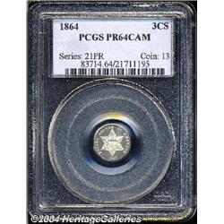<B>1864<3CS> PR64 Cameo PCGS.</B></I> A meticulously struck near-Gem with impressive frost on the devices. A pair of mint-made lintmarks are northwest of the date, and a few pinpoint planchet flaws (also of mint origin) are on the reverse field. A rare issue with Cameo contrast. Population: 4 in 64 Cameo, 7 finer (9/04). <BR><BR><B>Important notice:</B> Heritage usually auctions material at the rate of 200-250 lots per hour. On some occasions eBay Live bid software or the Internet may not be able to keep up with the pace of the auction. We recommend placing a realistic absentee bid now as insurance to avoid disappointment. Occasionally the auctioneer may eliminate or reject an eBay Live bid, and the auctioneer may also reopen a lot after the close of the eBay live bidding (usually because we missed an audience bid), and may reject your bid even if it shows you as the winning bidder. By bidding via eBay Live, you agree that Heritage may award the lot to another bidder at its sole discretion under the circumstances described above or any other reasonable circumstances. Since eBay bids are not shown to us until we open the lot on the floor, we treat those bids just like floor bids. In most cases the floor responds before the eBay bid is presented to us, due to Internet lag time, so for consistency we have made it a policy that floor bids are always considered first over tie eBay live bids. Also please note that all Heritage lots purchased through eBay Live carry a 20% Buyer's Premium. Please make sure you read the Terms and Conditions before you bid.