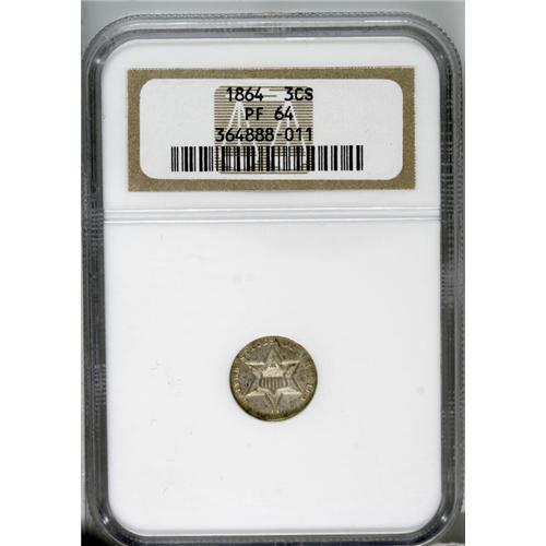 <B>1864<3CS> PR64 NGC.</B></I> An attractive, near-Gem example of this low mintage proof date. The surfaces are mostly brilliant with just the slightest accent of golden color on the obverse. Lightly hairlined (thus the grade) with a thin strike-through on the right side of the reverse.<BR><I>From The Steve Glenn Collection.</B></I> <BR><BR><B>Important notice:</B> Heritage usually auctions material at the rate of 200-250 lots per hour. On some occasions eBay Live bid software or the Internet may not be able to keep up with the pace of the auction. We recommend placing a realistic absentee bid now as insurance to avoid disappointment. Occasionally the auctioneer may eliminate or reject an eBay Live bid, and the auctioneer may also reopen a lot after the close of the eBay live bidding (usually because we missed an audience bid), and may reject your bid even if it shows you as the winning bidder. By bidding via eBay Live, you agree that Heritage may award the lot to another bidder at its sole discretion under the circumstances described above or any other reasonable circumstances. Since eBay bids are not shown to us until we open the lot on the floor, we treat those bids just like floor bids. In most cases the floor responds before the eBay bid is presented to us, due to Internet lag time, so for consistency we have made it a policy that floor bids are always considered first over tie eBay live bids. Also please note that all Heritage lots purchased through eBay Live carry a 20% Buyer's Premium. Please make sure you read the Terms and Conditions before you bid. This lot is being auctioned in conjunction with a live floor auction by Heritage Galleries & Auctioneers. All final auction and invoice information will be supplied by Heritage Galleries & Auctioneers, and all other information should be considered preliminary. Lot:770 <BR><BR><B>Winning Notification and Billing:</B> After the FINAL session in this auction is complete, Heritage will send e-mail and snail mail invoices. This process normally takes several days. All final auction and invoice information will be supplied by Heritage Galleries & Auctioneers, and all other information should be considered preliminary. <BR><BR>This auction will be conducted on a live auction floor and over the Internet through eBay Live. If you choose to place an absentee bid, please take a moment to <font color='#0000ff'><u><a href='http://pages.ebay.com/liveauctions/help/before/laabsentee.html'>learn how eBay Live absentee bidding works</a></u></font><font color='#000000'>