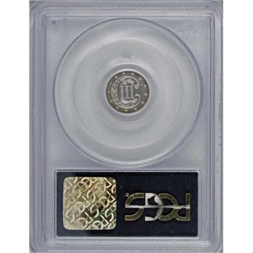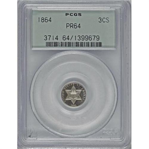 <B>1864 3CS PR64 PCGS.</B></I> A needle-sharp near-Gem with light gold toning along the margins. Encased in an old green label holder. Only 470 proofs were struck for this Civil War date. Population: 59 in 64, 45 finer (8/07).<BR><BR><B>Coin Engraver:</B> James B. Longacre<BR><BR><b>Shipping:</b> Coins & Currency (<a target="_blank" href="http://www.heritageauctions.com/common/shipping.php">view shipping information</a>)