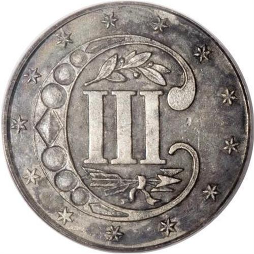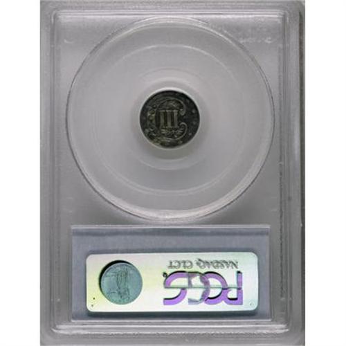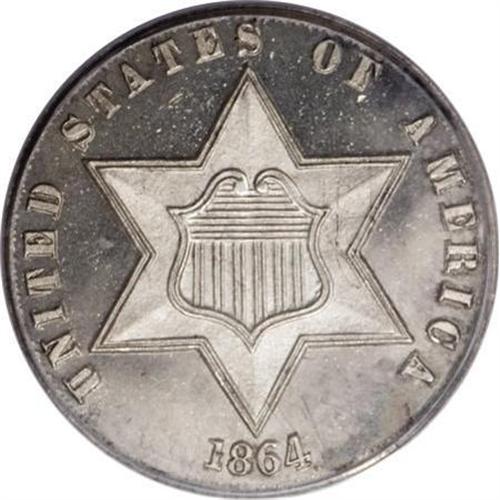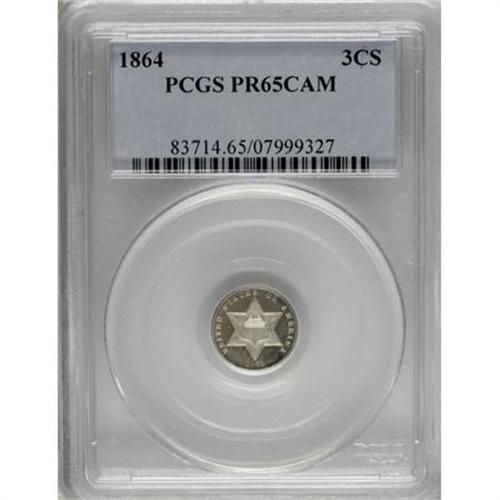 <B>1864 3CS PR65 Cameo PCGS.</B></I> As the Civil War progressed into its fourth year and hoarding of silver coins became more and more of a problem, the Philadelphia mint reduced its production of smaller silver denominations to token mintages. Just 460 proofs and 12,000 business strikes were issued of the diminutive three cent silver. This glittering specimen exhibits pinpoint sharpness and appreciable contrast. The obverse is essentially brilliant while a veil of steel-violet toning coats the reverse. A small planchet flaw is noted near the reverse border at 7 o'clock. Population: 10 in 65, 6 finer (7/07).<BR><BR><b>Shipping:</b> Coins & Currency (<a target="_blank" href="http://www.heritageauctions.com/common/shipping.php">view shipping information</a>\)