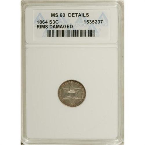 <B>1864 3CS --Rim Damaged--ANACS. MS60 Details.</B></I> NGC Census: (0/69). PCGS Population (1/75). Mintage: 12,000. Numismedia Wsl. Price for NGC/PCGS coin in MS60: $700. (#3684)<BR><BR><b>Shipping:</b> Coins & Currency (<a target="_blank" href="http://www.heritageauctions.com/common/shipping.php">view shipping information</a>)