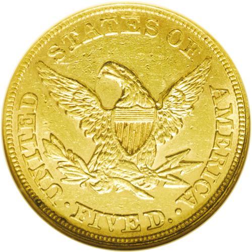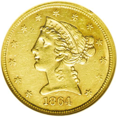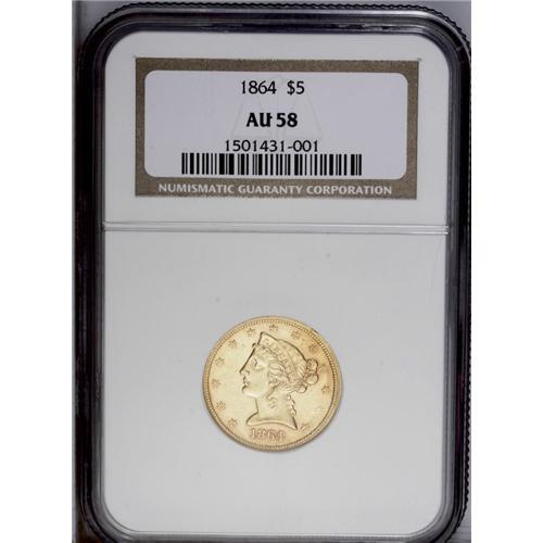 1864 $5 AU58 NGC. With a mintage of only 4,100 busines