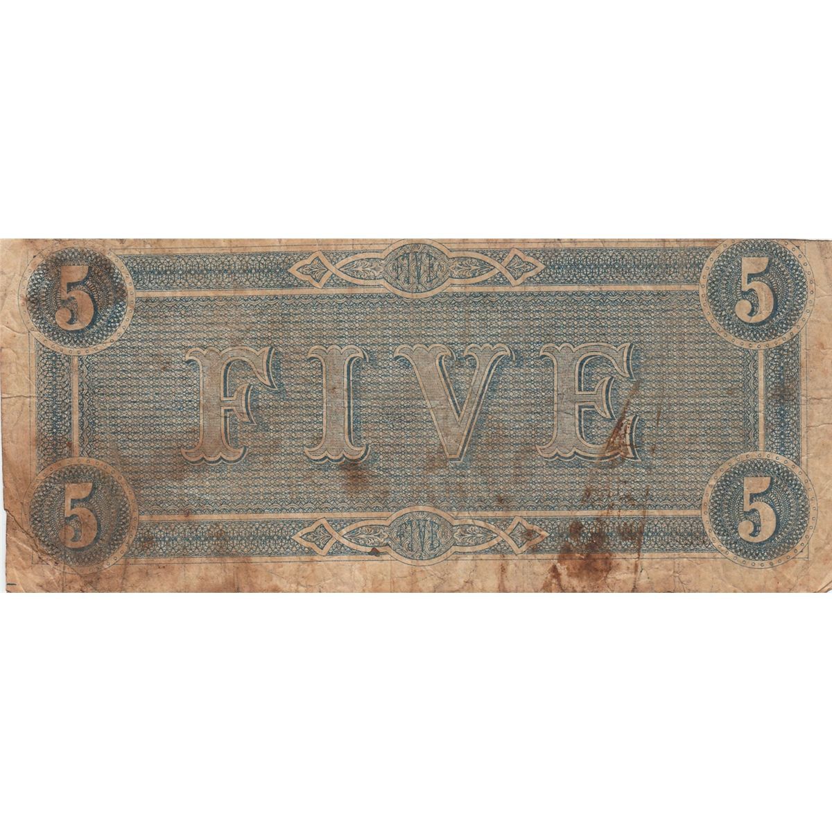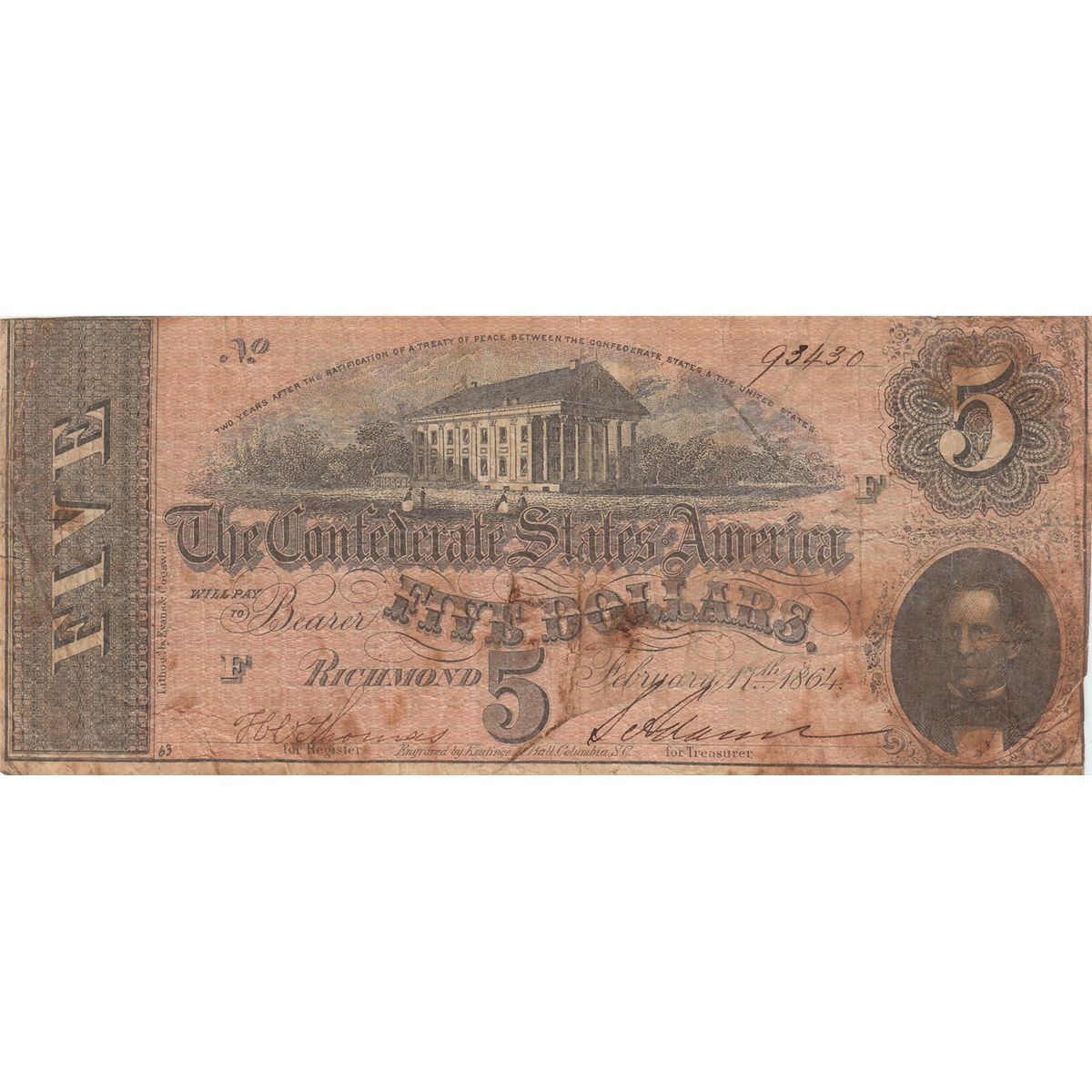 1864 $5 CSA CONFEDERATE CIVIL WAR CURRENCY