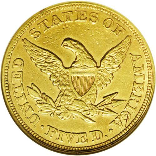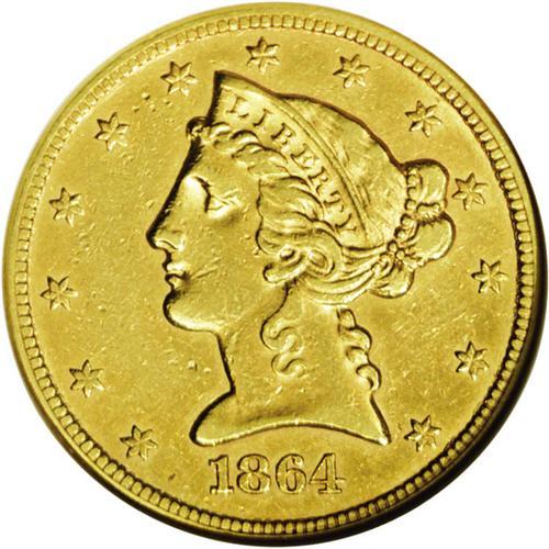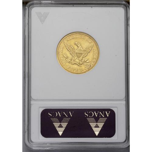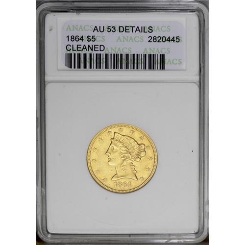 <B>1864<$5>--Cleaned--ANACS. AU53 Details.</B></I> A glossy and bright peach-gold rare date Civil War half eagle. Little wear is detected, but the strike shows some bluntness on the bust truncation and hair bun. A mint-made lamination is affixed by a hinge to the piece at 5 o'clock on the reverse. A scant 4,170 pieces were produced, and only a slender portion of those have survived in any grade. <BR><BR><B>Important notice:</B> Heritage usually auctions material at the rate of 200-250 lots per hour. On some occasions eBay Live bid software or the Internet may not be able to keep up with the pace of the auction. We recommend placing a realistic absentee bid now as insurance to avoid disappointment. Occasionally the auctioneer may eliminate or reject an eBay Live bid, and the auctioneer may also reopen a lot after the close of the eBay live bidding (usually because we missed an audience bid), and may reject your bid even if it shows you as the winning bidder. By bidding via eBay Live, you agree that Heritage may award the lot to another bidder at its sole discretion under the circumstances described above or any other reasonable circumstances. Since eBay bids are not shown to us until we open the lot on the floor, we treat those bids just like floor bids. In most cases the floor responds before the eBay bid is presented to us, due to Internet lag time, so for consistency we have made it a policy that floor bids are always considered first over tie eBay live bids. Also please note that all Heritage lots purchased through eBay Live carry a 20% Buyer's Premium. Please make sure you read the Terms and Conditions before you bid. This lot is being auctioned in conjunction with a live floor auction by Heritage Galleries & Auctioneers. All final auction and invoice information will be supplied by Heritage Galleries & Auctioneers, and all other information should be considered preliminary. Lot:2758 <BR><BR><B>Winning Notification and Billing:</B> After the FINAL session in this auction is complete, Heritage will send e-mail and snail mail invoices. This process normally takes several days. All final auction and invoice information will be supplied by Heritage Galleries & Auctioneers, and all other information should be considered preliminary. <BR><BR>This auction will be conducted on a live auction floor and over the Internet through eBay Live. If you choose to place an absentee bid, please take a moment to <font color='#0000ff'><u><a href='http://pages.ebay.com/liveauctions/help/before/laabsentee.html'>learn how eBay Live absentee bidding works</a></u></font><font color='#000000'>