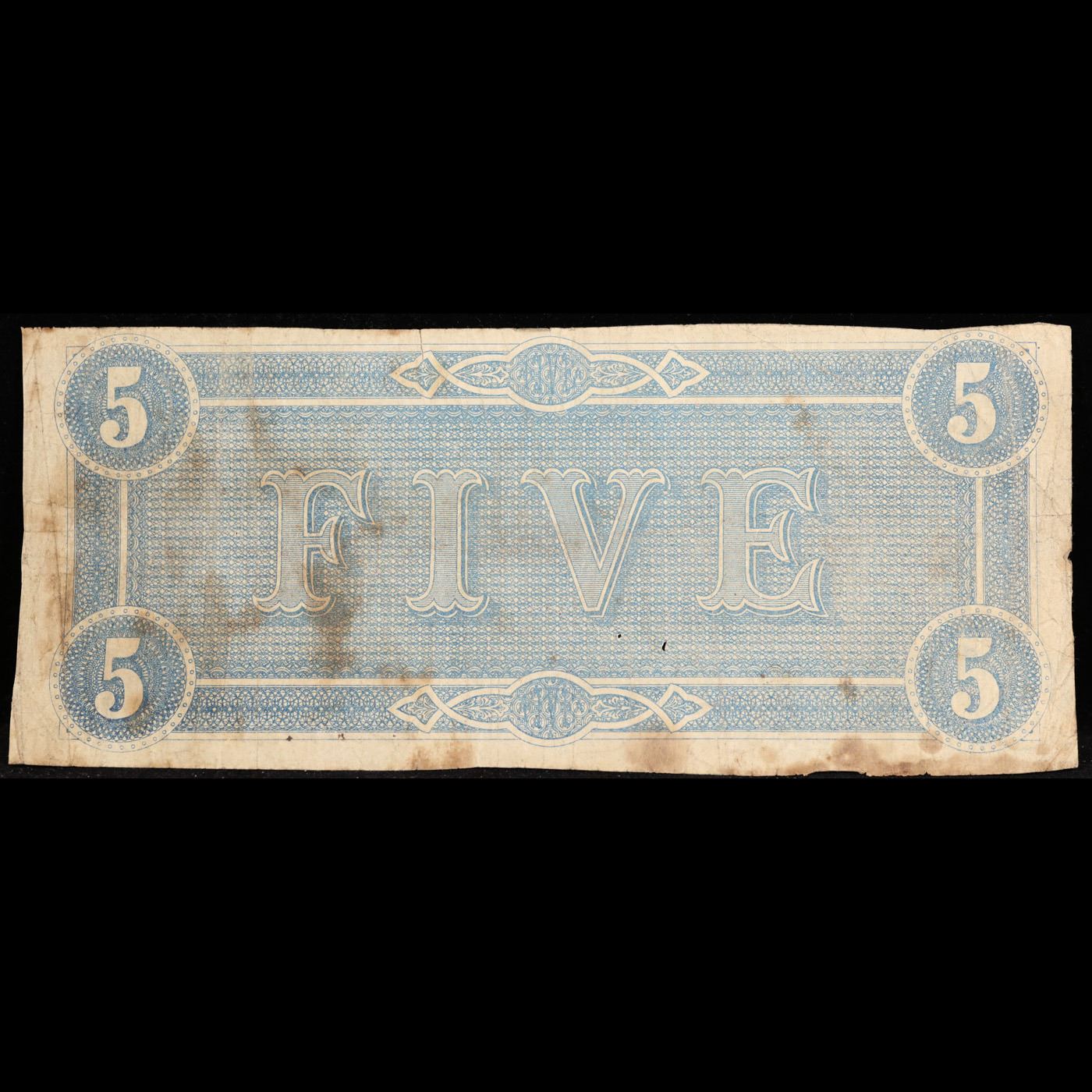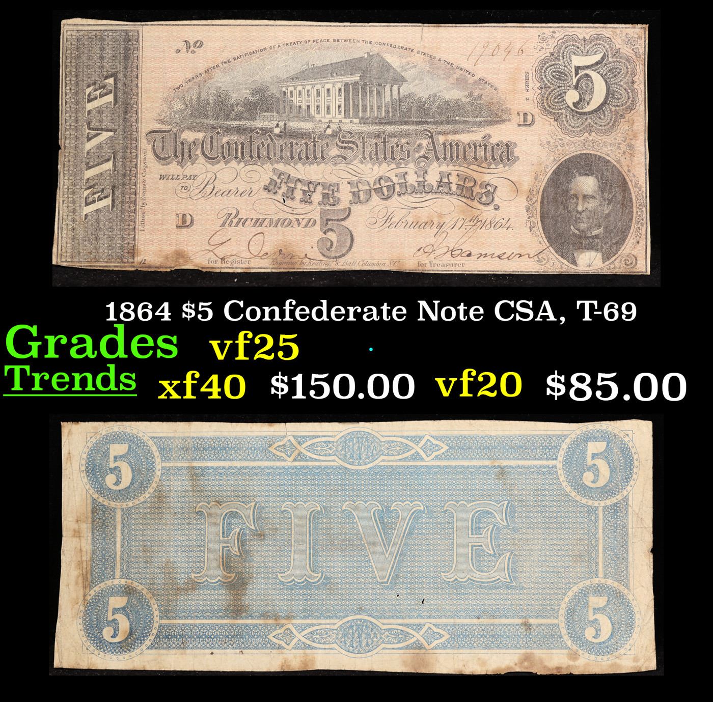 1864 $5 Confederate Note CSA, T-69 Grades vf+