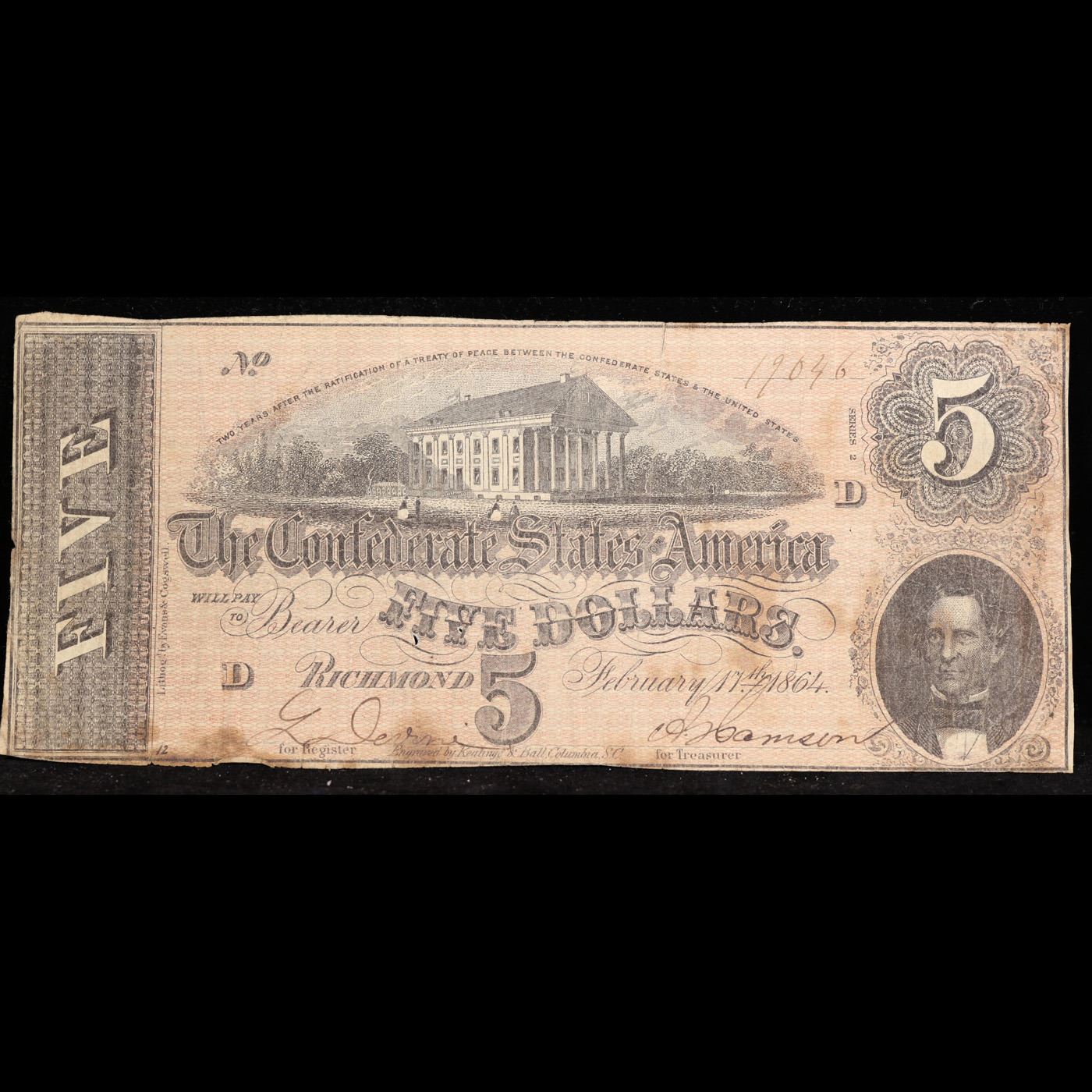 1864 $5 Confederate Note CSA, T-69 Grades vf+. From the seventh and last issue of Confederate currency, these bills were authorized in February 1864. When these $5 notes were issued over 150 years ago, each one was individually signed and numbered. This $5 Confederate note has a pink overprint and a picture of the Virginia State Capitol in the center. In the lower right corner of the note is a picture of C.G. Memminger. This note was printed on plain paper with pink and black ink on the front and blue ink on the back.