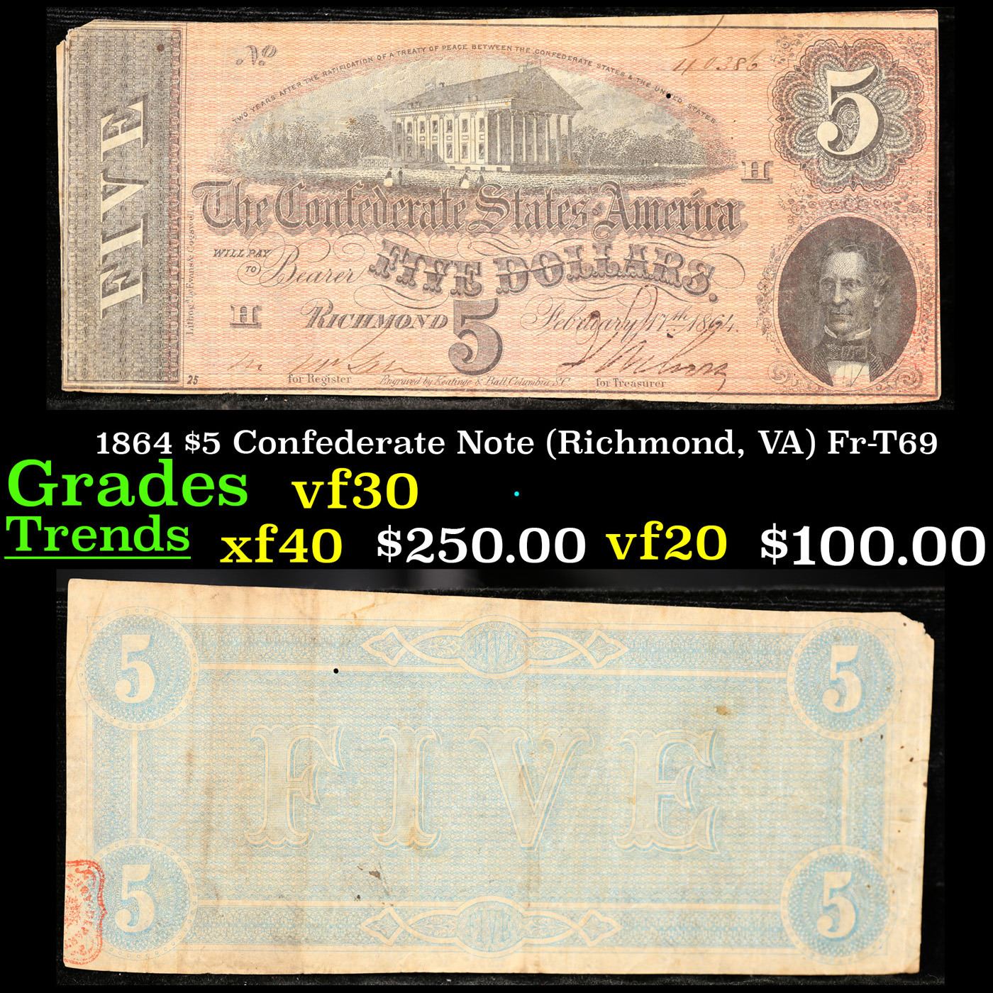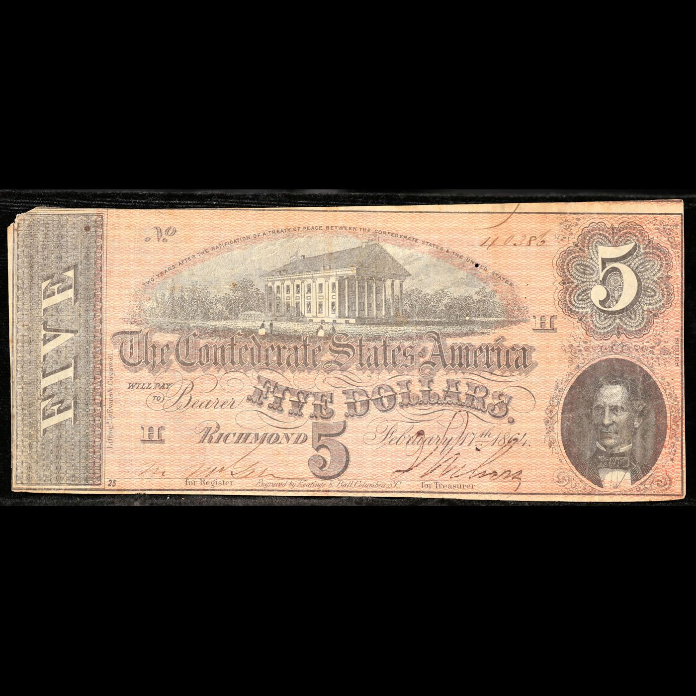1864 $5 Confederate Note (Richmond, VA) Fr-T69 Grades vf++. From the seventh and last issue of Confederate currency, these bills were authorized in February 1864. When these $5 notes were issued over 150 years ago, each one was individually signed and numbered. This $5 Confederate note has a pink overprint and a picture of the Virginia State Capitol in the center. In the lower right corner of the note is a picture of C.G. Memminger. This note was printed on plain paper with pink and black ink on the front and blue ink on the back.