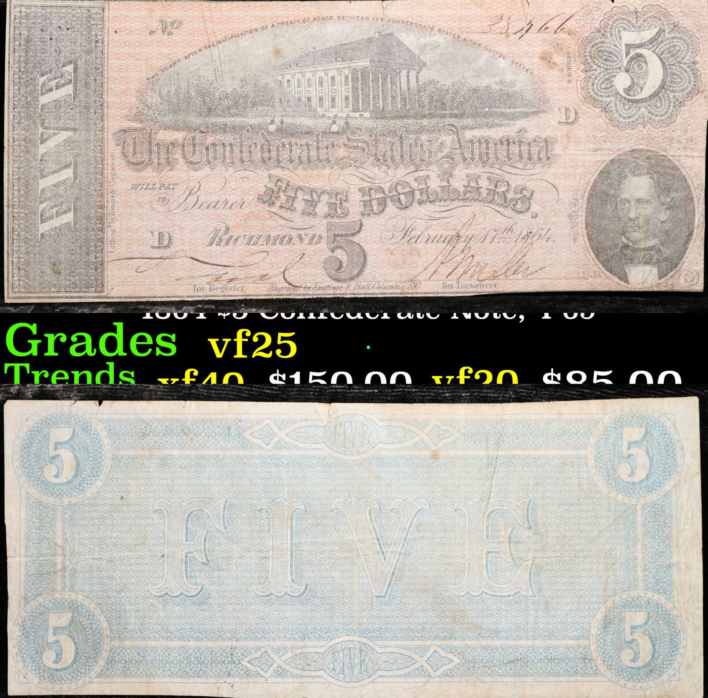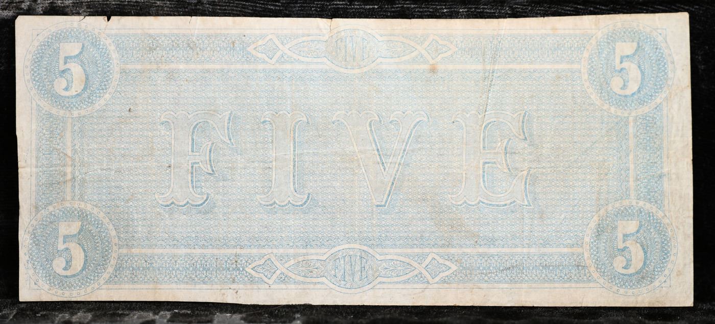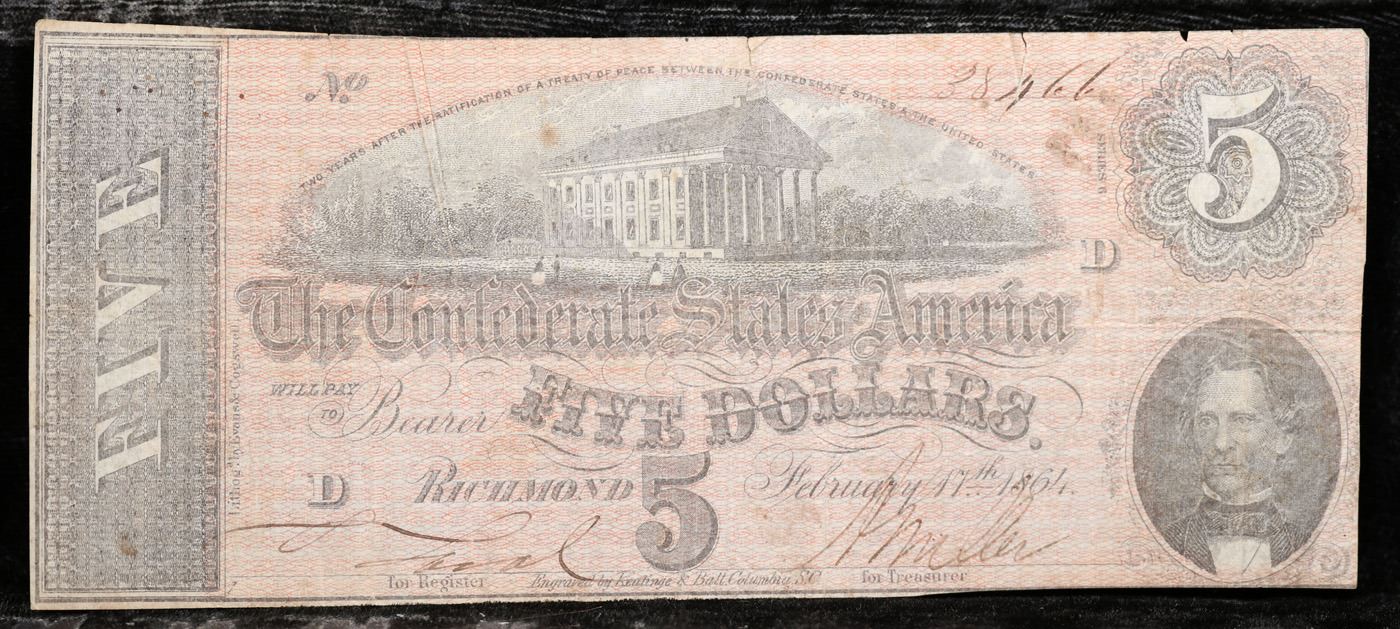 1864 $5 Confederate Note, T-69 Grades vf+. From the seventh and last issue of Confederate currency, these bills were authorized in February 1864. When these $5 notes were issued over 150 years ago, each one was individually signed and numbered. This $5 Confederate note has a pink overprint and a picture of the Virginia State Capitol in the center. In the lower right corner of the note is a picture of C.G. Memminger. This note was printed on plain paper with pink and black ink on the front and blue ink on the back.