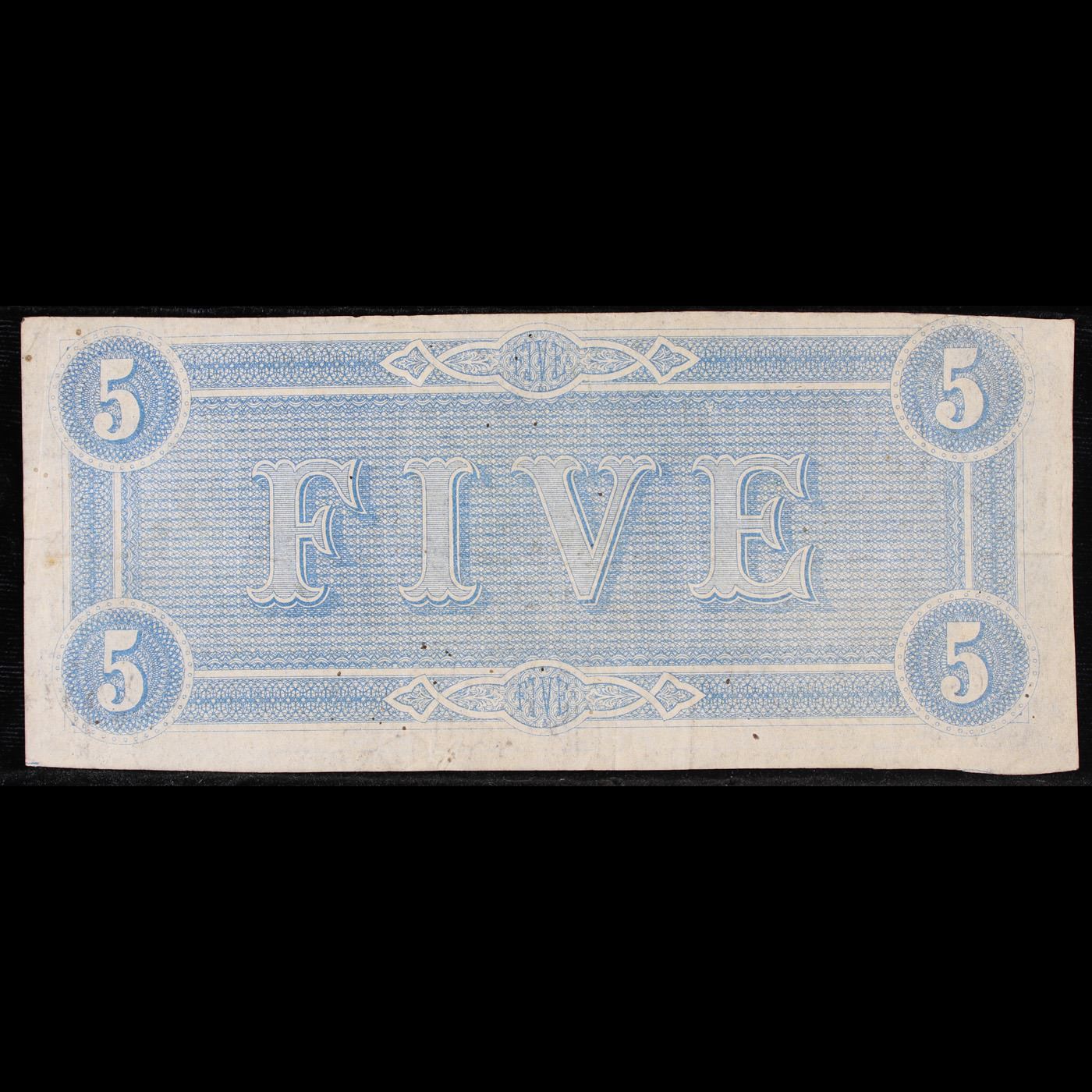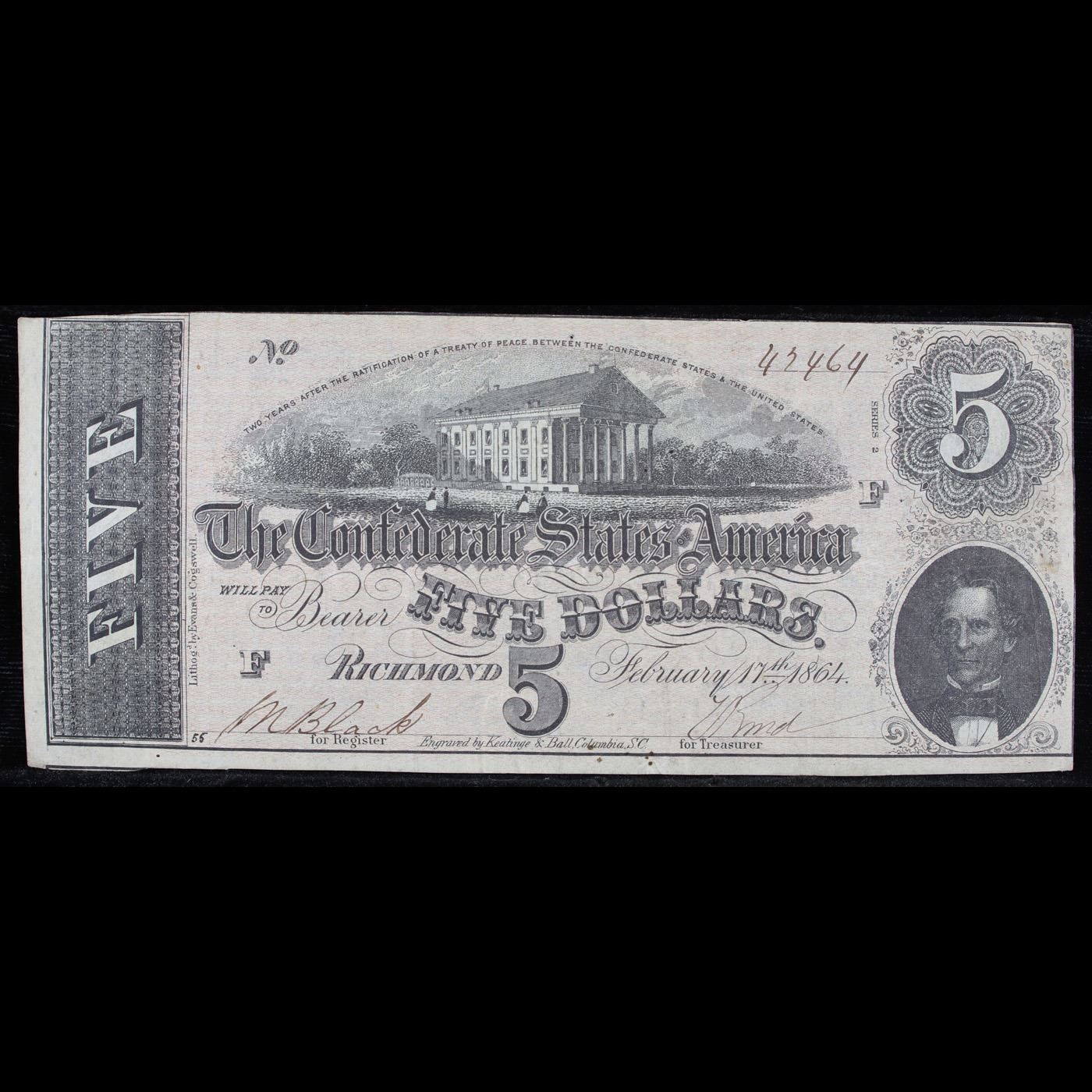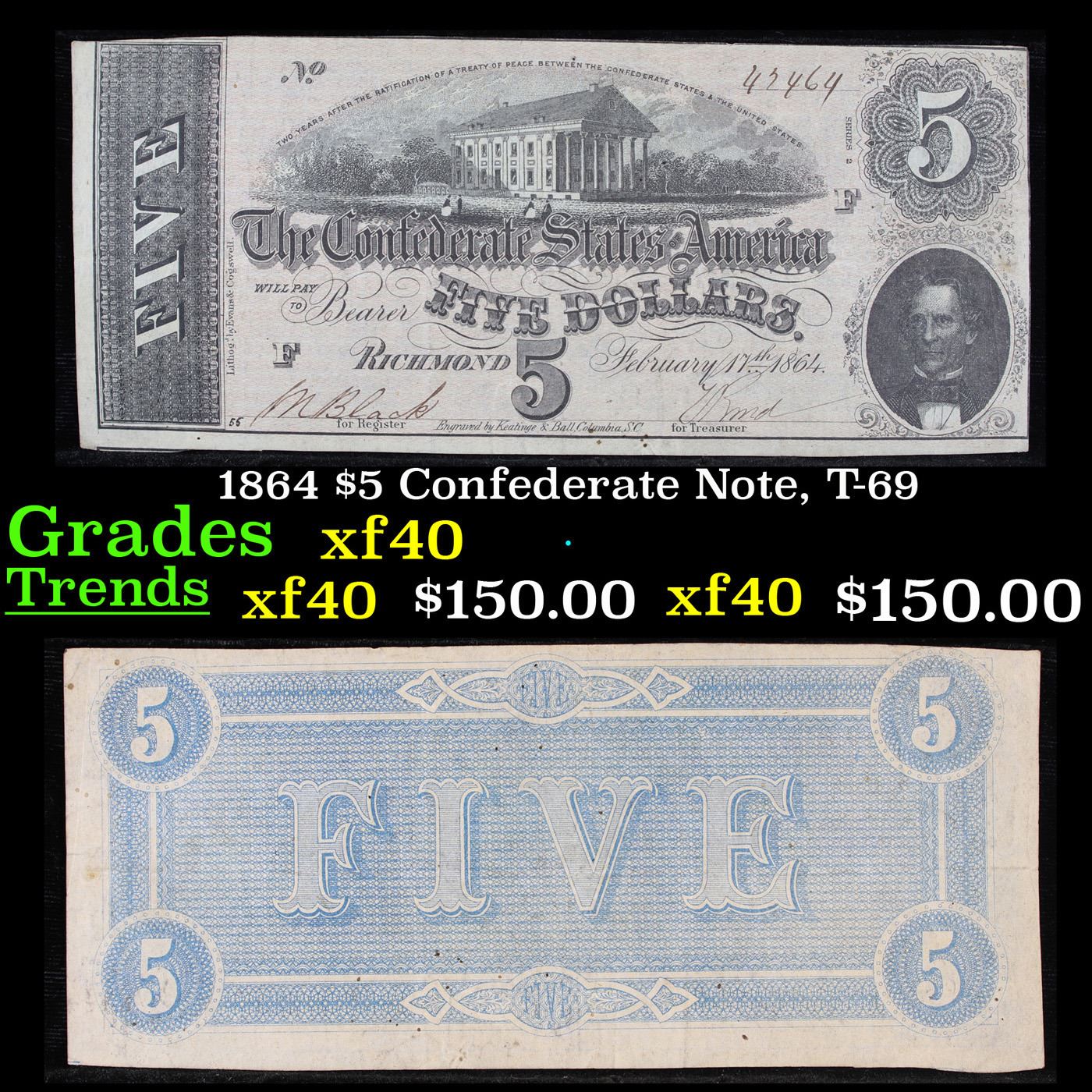 1864 $5 Confederate Note, T-69 Grades xf. From the seventh and last issue of Confederate currency, these bills were authorized in February 1864. When these $5 notes were issued over 150 years ago, each one was individually signed and numbered. This $5 Confederate note has a pink overprint and a picture of the Virginia State Capitol in the center. In the lower right corner of the note is a picture of C.G. Memminger. This note was printed on plain paper with pink and black ink on the front and blue ink on the back.
