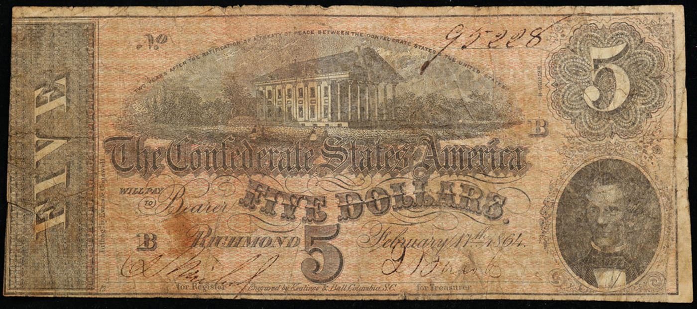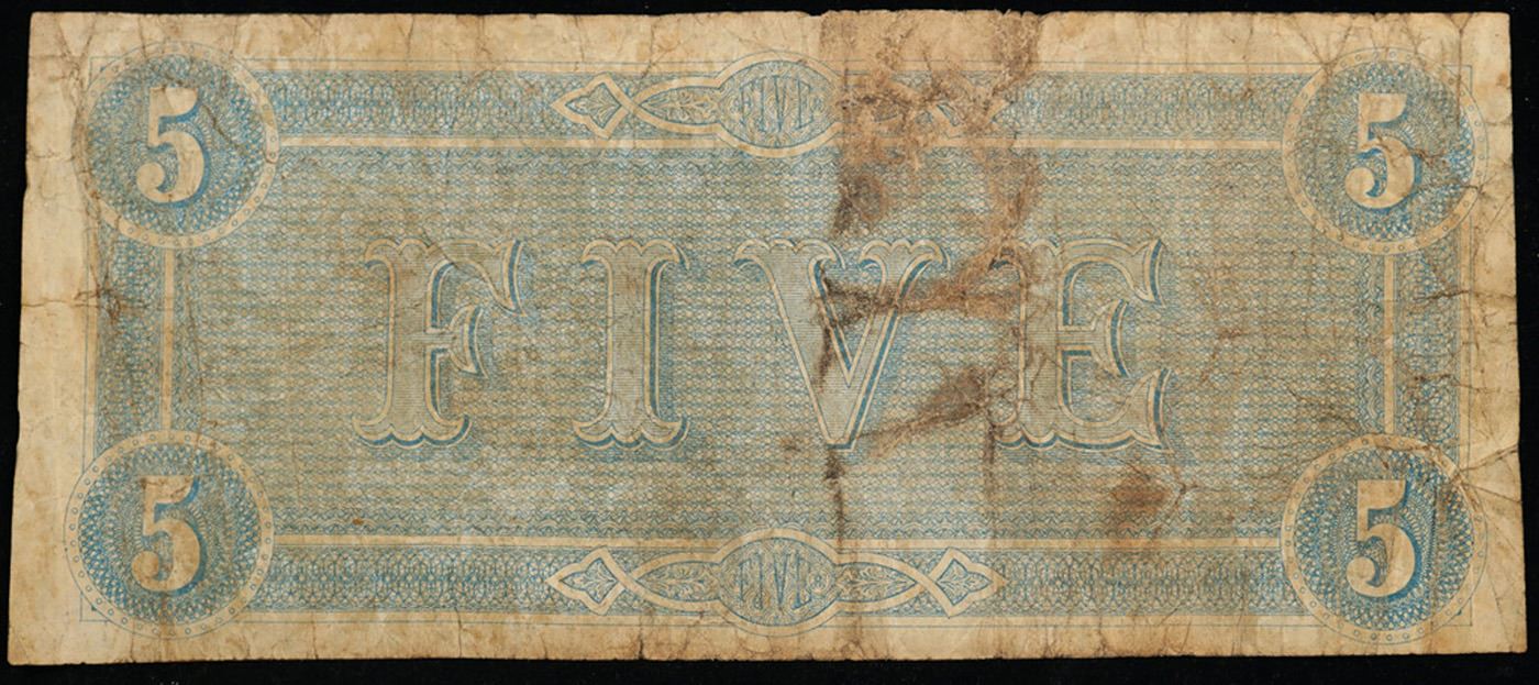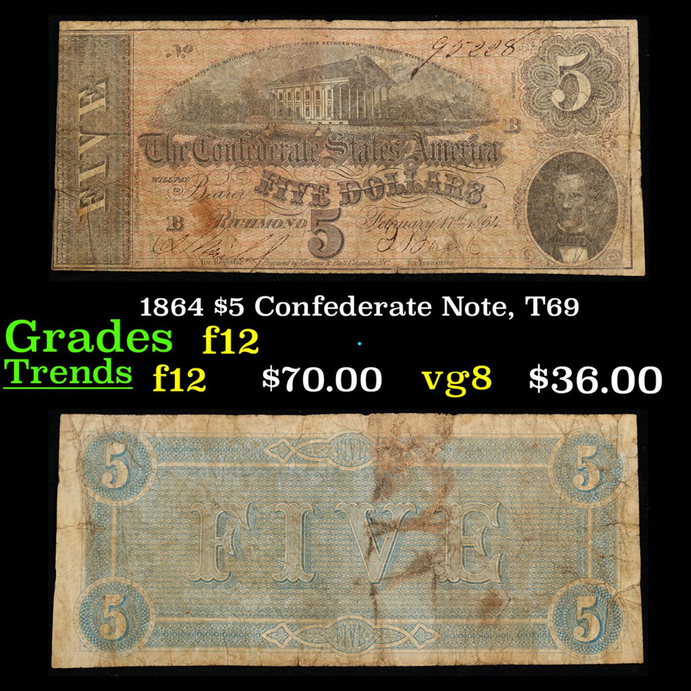 1864 $5 Confederate Note, T69 Grades f, fine.