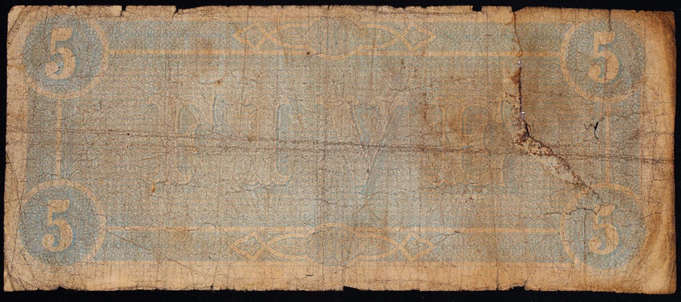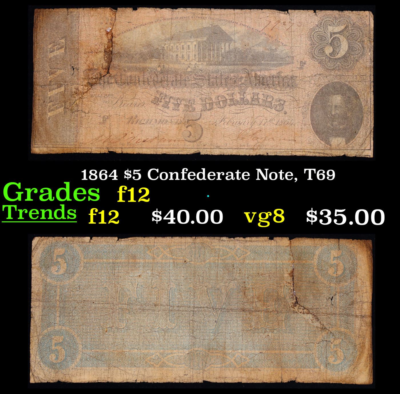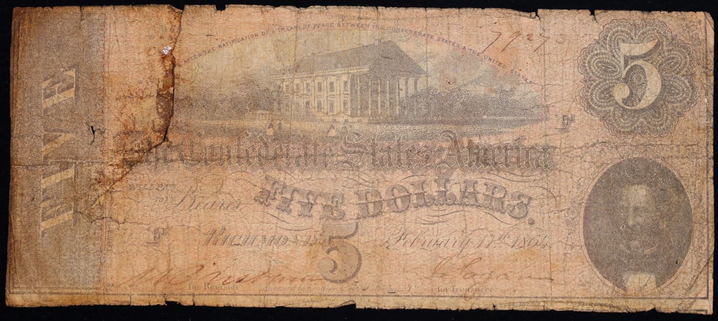 1864 $5 Confederate Note, T69 Grades f, fine. From the seventh and last issue of Confederate currency, these bills were authorized in February 1864. When these $5 notes were issued over 150 years ago, each one was individually signed and numbered. This $5 Confederate note has a pink overprint and a picture of the Virginia State Capitol in the center. In the lower right corner of the note is a picture of C.G. Memminger. This note was printed on plain paper with pink and black ink on the front and blue ink on the back.