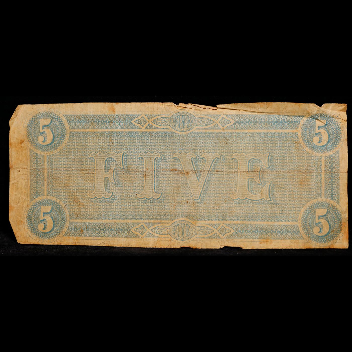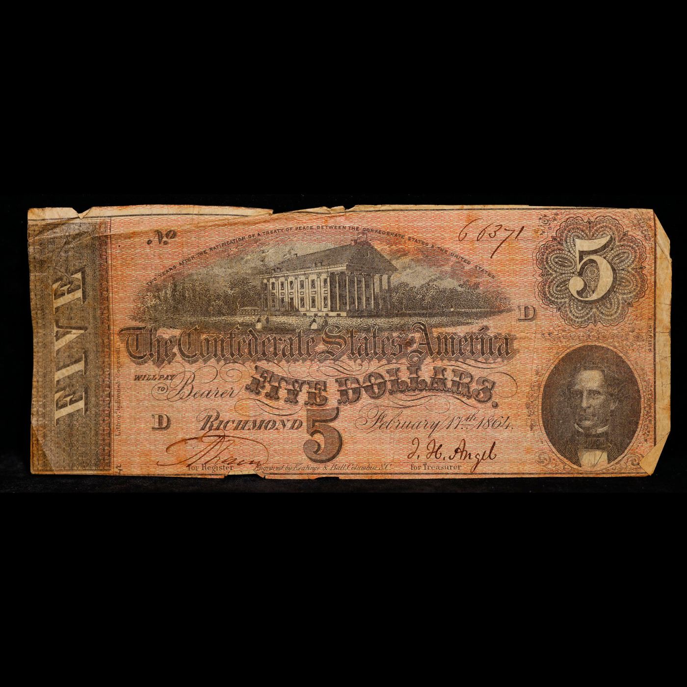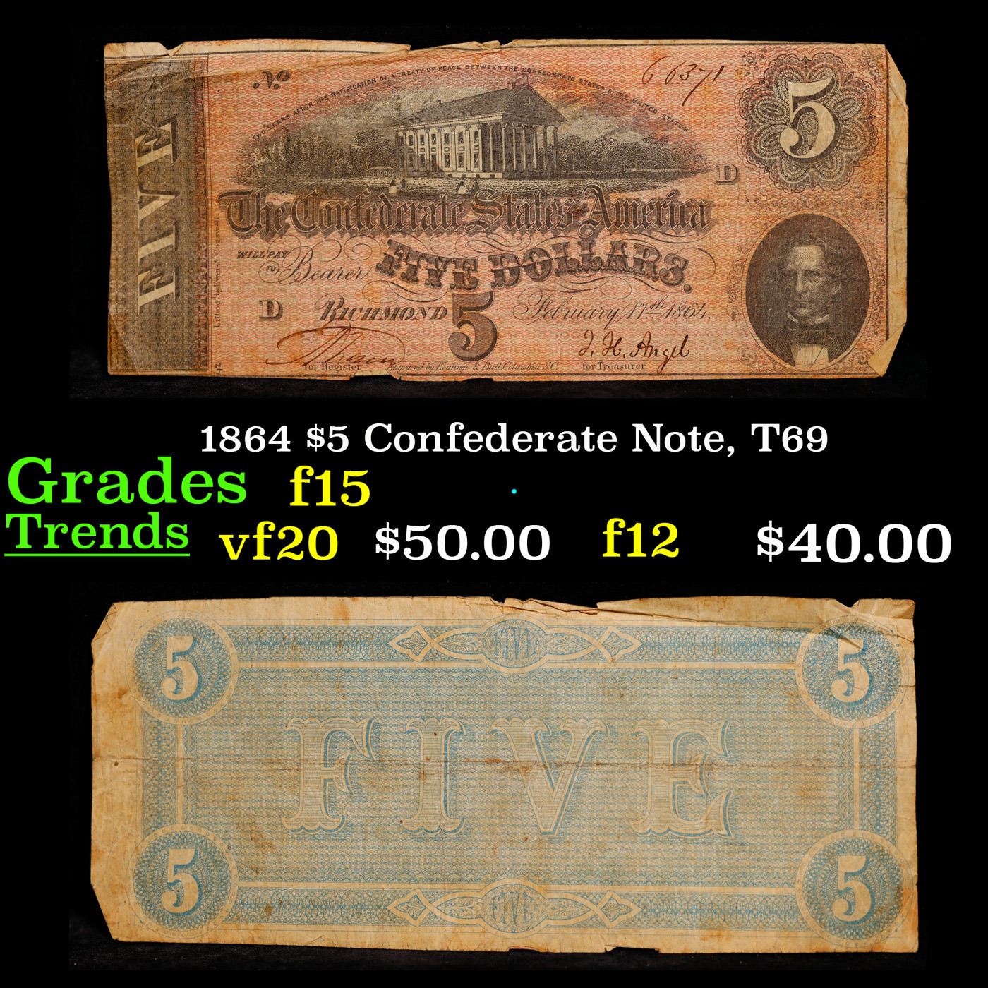 1864 $5 Confederate Note, T69 Grades f+. From the seventh and last issue of Confederate currency, these bills were authorized in February 1864. When these $5 notes were issued over 150 years ago, each one was individually signed and numbered. This $5 Confederate note has a pink overprint and a picture of the Virginia State Capitol in the center. In the lower right corner of the note is a picture of C.G. Memminger. This note was printed on plain paper with pink and black ink on the front and blue ink on the back.