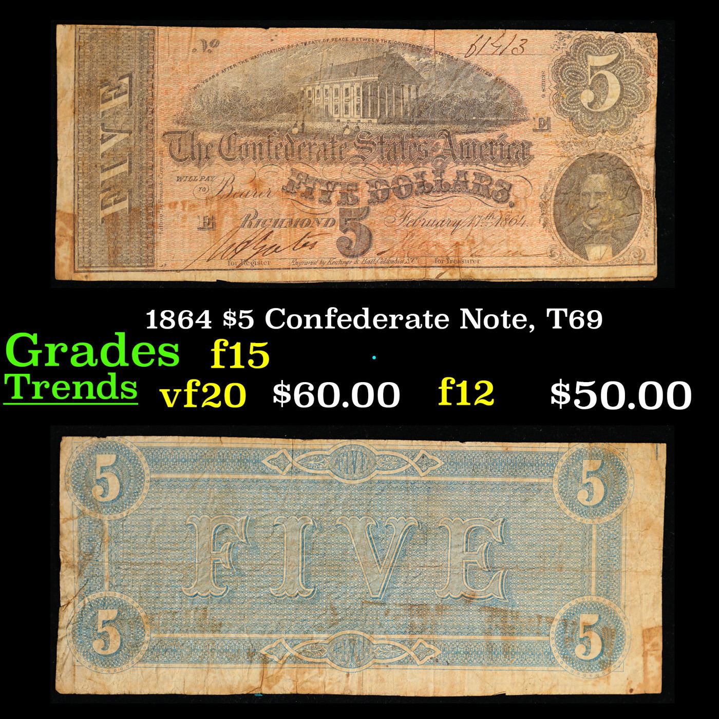 1864 $5 Confederate Note, T69 Grades f+