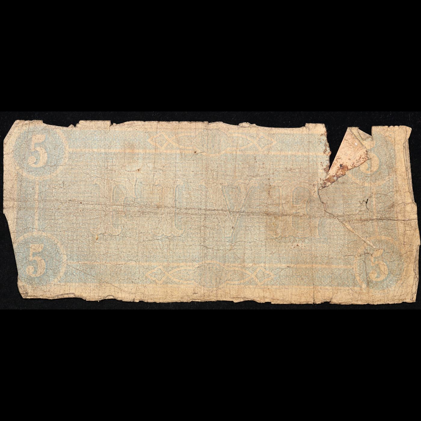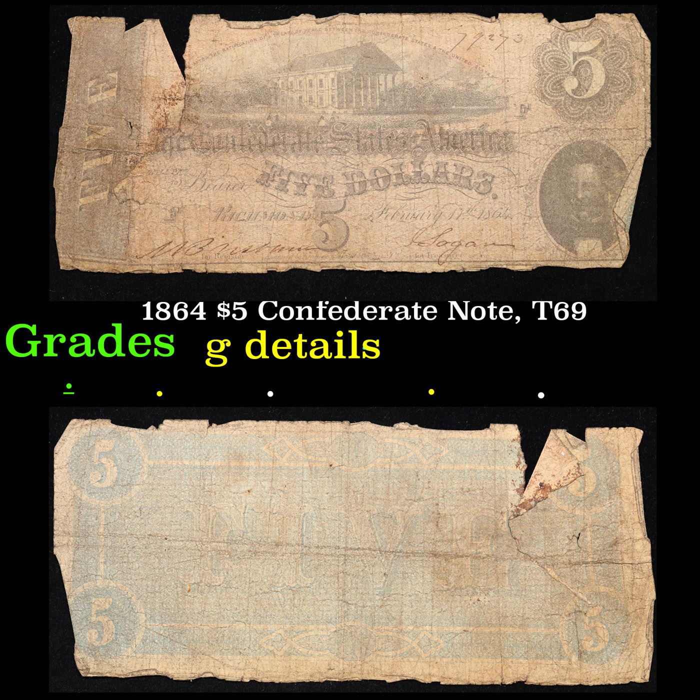 1864 $5 Confederate Note, T69 Grades g details
