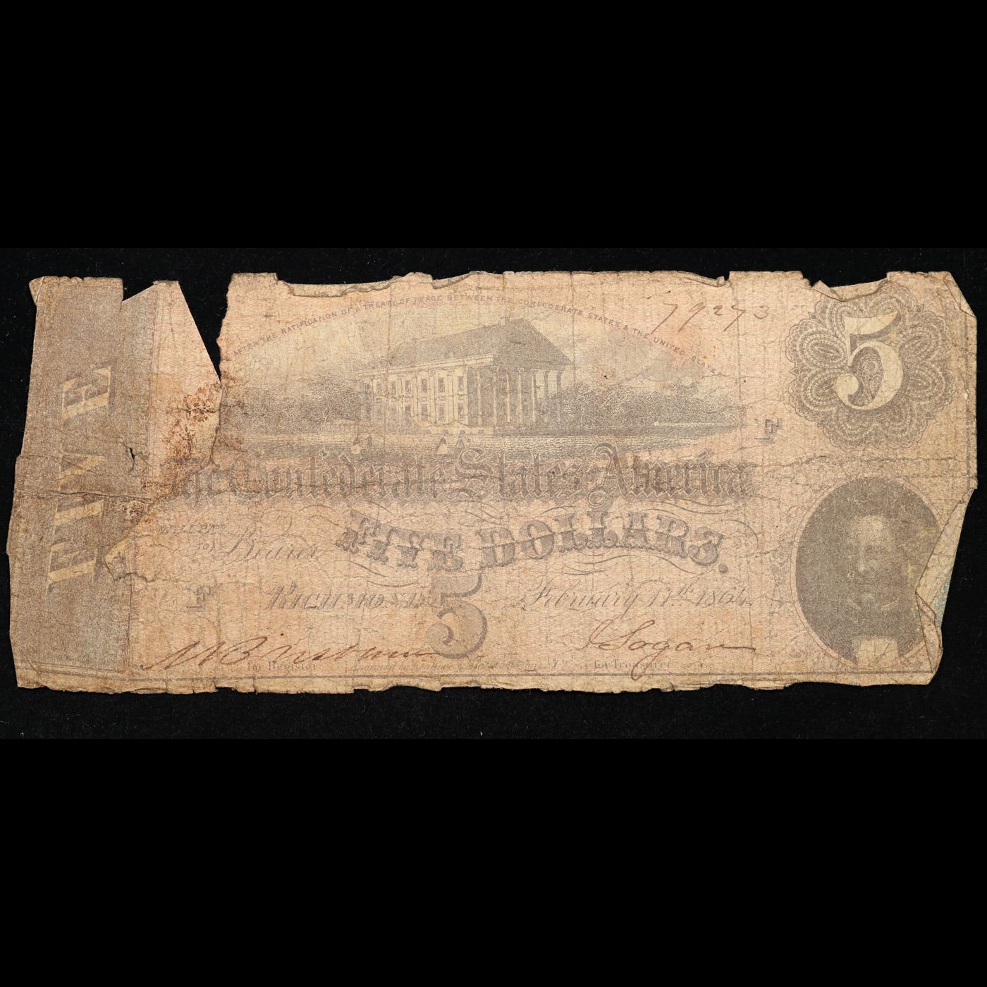 1864 $5 Confederate Note, T69 Grades g details. From the seventh and last issue of Confederate currency, these bills were authorized in February 1864. When these $5 notes were issued over 150 years ago, each one was individually signed and numbered. This $5 Confederate note has a pink overprint and a picture of the Virginia State Capitol in the center. In the lower right corner of the note is a picture of C.G. Memminger. This note was printed on plain paper with pink and black ink on the front and blue ink on the back.