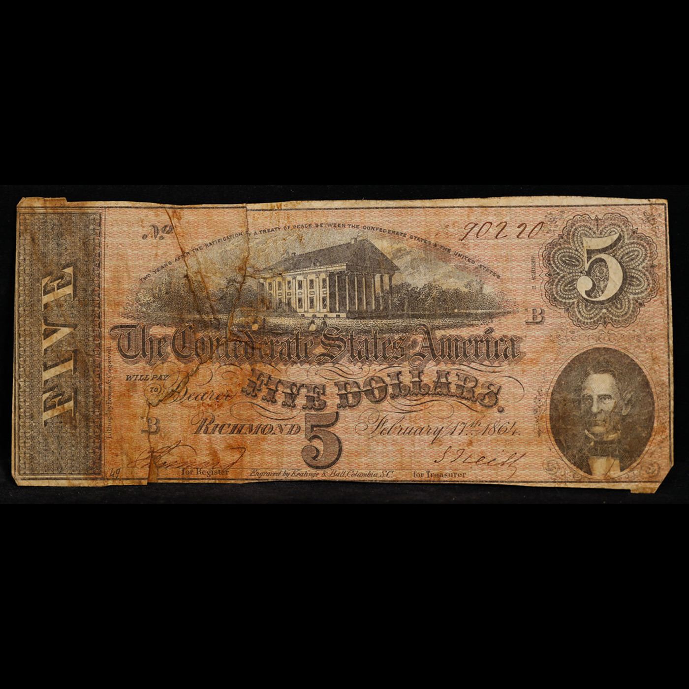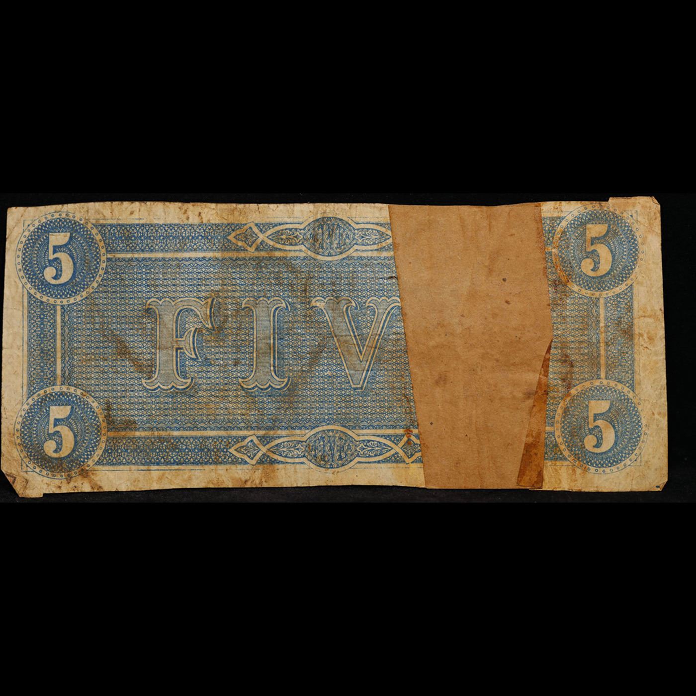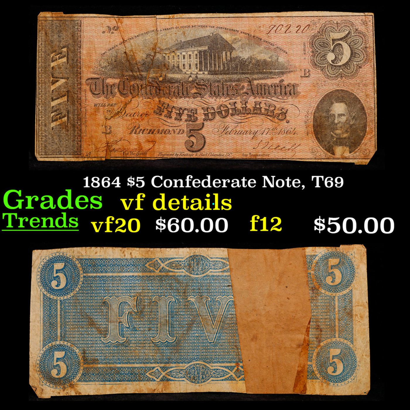 1864 $5 Confederate Note, T69 Grades vf details. From the seventh and last issue of Confederate currency, these bills were authorized in February 1864. When these $5 notes were issued over 150 years ago, each one was individually signed and numbered. This $5 Confederate note has a pink overprint and a picture of the Virginia State Capitol in the center. In the lower right corner of the note is a picture of C.G. Memminger. This note was printed on plain paper with pink and black ink on the front and blue ink on the back.
