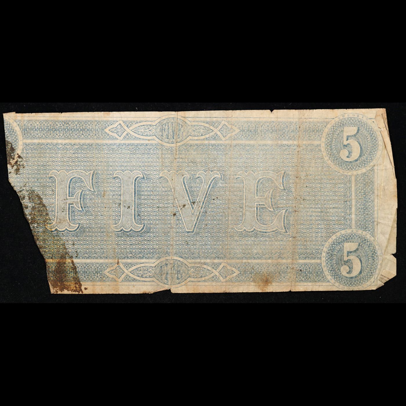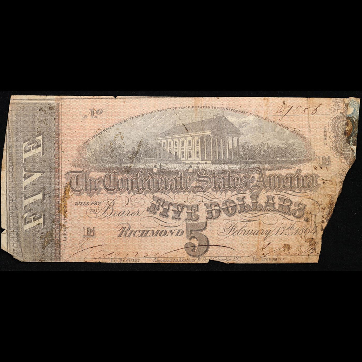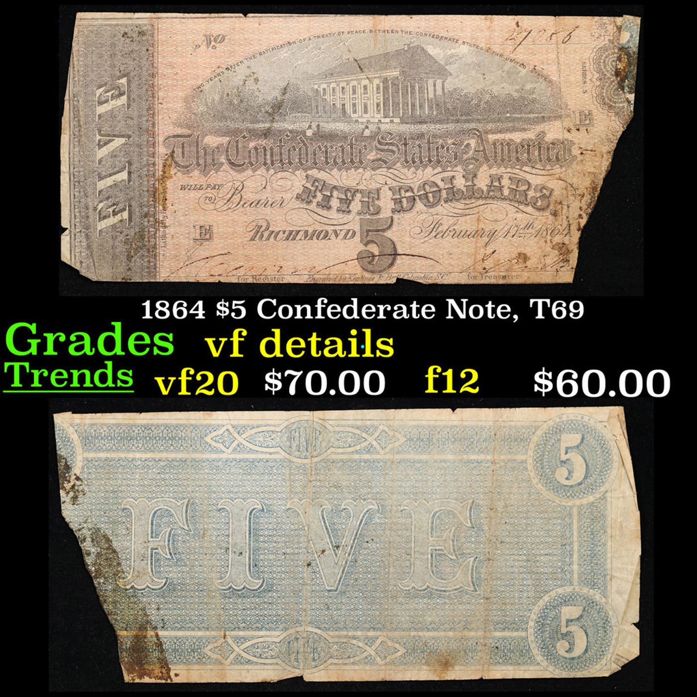 1864 $5 Confederate Note, T69 Grades vf details. From the seventh and last issue of Confederate currency, these bills were authorized in February 1864. When these $5 notes were issued over 150 years ago, each one was individually signed and numbered. This $5 Confederate note has a pink overprint and a picture of the Virginia State Capitol in the center. In the lower right corner of the note is a picture of C.G. Memminger. This note was printed on plain paper with pink and black ink on the front and blue ink on the back.