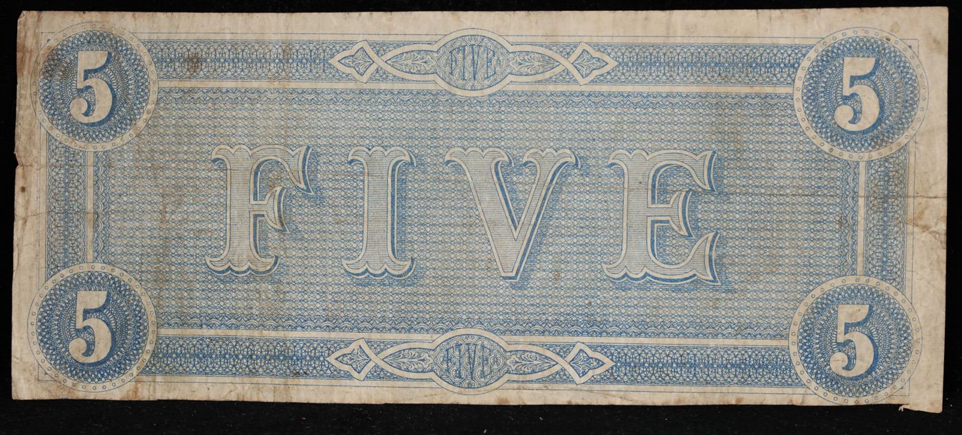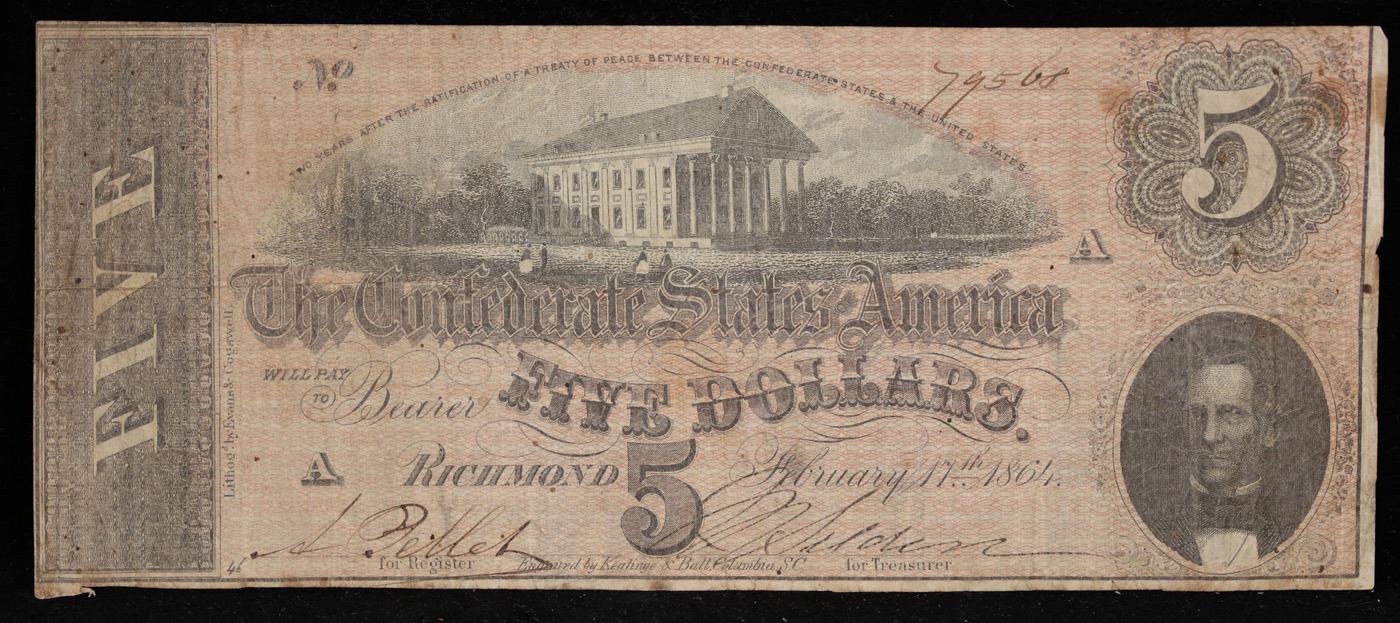 1864 $5 Confederate Note, T69 Grades vf+. From the seventh and last issue of Confederate currency, these bills were authorized in February 1864. When these $5 notes were issued over 150 years ago, each one was individually signed and numbered. This $5 Confederate note has a pink overprint and a picture of the Virginia State Capitol in the center. In the lower right corner of the note is a picture of C.G. Memminger. This note was printed on plain paper with pink and black ink on the front and blue ink on the back.